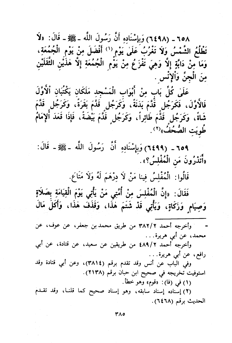 6498 - وَبِإِسْنَادِهِ أَنَّ رَسُولَ اللَّهِ صَلَّى اللهُ عَلَيْهِ وَسَلَّمَ قَالَ: «§لَا تَطْلُعُ الشَّمْسُ وَلَا تَغْرُبُ عَلَى يَوْمٍ أَفْضَلَ مِنْ يَوْمِ الْجُمُعَةِ، وَمَا مِنْ دَابَّةٍ إِلَّا وَهِيَ تَفْزَعُ مِنْ يَوْمِ الْجُمُعَةِ إِلَّا هَذَيْنِ الثَّقَلَيْنِ مِنَ الْجِنِّ وَالْإِنْسِ، عَلَى كُلِّ بَابٍ مِنْ أَبْوَابِ الْمَسْجِدِ مَلَكَانِ يَكْتُبَانِ الْأَوَّلَ فَالْأَوَّلَ، فَكَرَجُلٍ قَدَّمَ بَدَنَةً، وَكَرَجُلٍ قَدَّمَ بَقَرَةً، وَكَرَجُلٍ قَدَّمَ شَاةً، وَكَرَجُلٍ قَدَّمَ طَائِرًا، وَكَرَجُلٍ قَدَّمَ بَيْضَةً، فَإِذَا قَعَدَ الْإِمَامُ طُوِيَتِ الصُّحُفُ» Kإسناده صحيح
