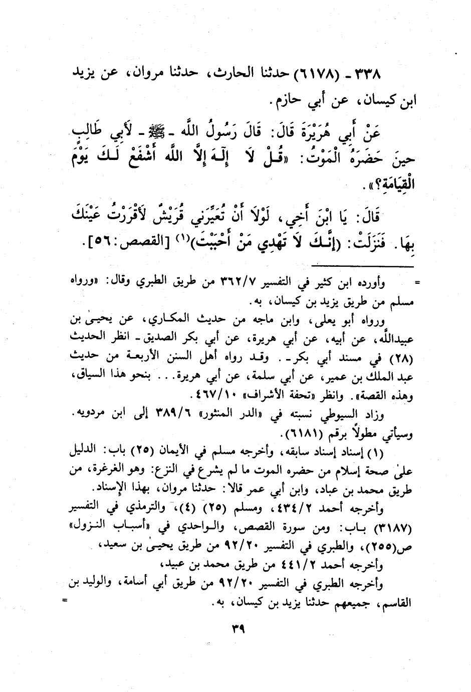6178 - حَدَّثَنَا الْحَارِثُ، حَدَّثَنَا مَرْوَانُ، عَنْ يَزِيدَ بْنِ كَيْسَانَ، عَنْ أَبِي حَازِمٍ، عَنْ أَبِي هُرَيْرَةَ قَالَ: قَالَ رَسُولُ اللَّهِ صَلَّى اللهُ عَلَيْهِ وَسَلَّمَ لِأَبِي طَالِبٍ حِينَ حَضَرَهُ الْمَوْتُ: «§قُلْ لَا إِلَهَ إِلَّا اللَّهُ أَشْفَعُ لَكَ يَوْمَ الْقِيَامَةِ»، قَالَ: يَا ابْنَ أَخِي لَوْلَا أَنْ تُعَيِّرَنِي قُرَيْشٌ لَأَقْرَرْتُ عَيْنَكَ بِهَا، فَنَزَلَتْ {إِنَّكَ لَا تَهْدِي مَنْ أَحْبَبْتَ} [القصص: 56] Kإسناده حسن
