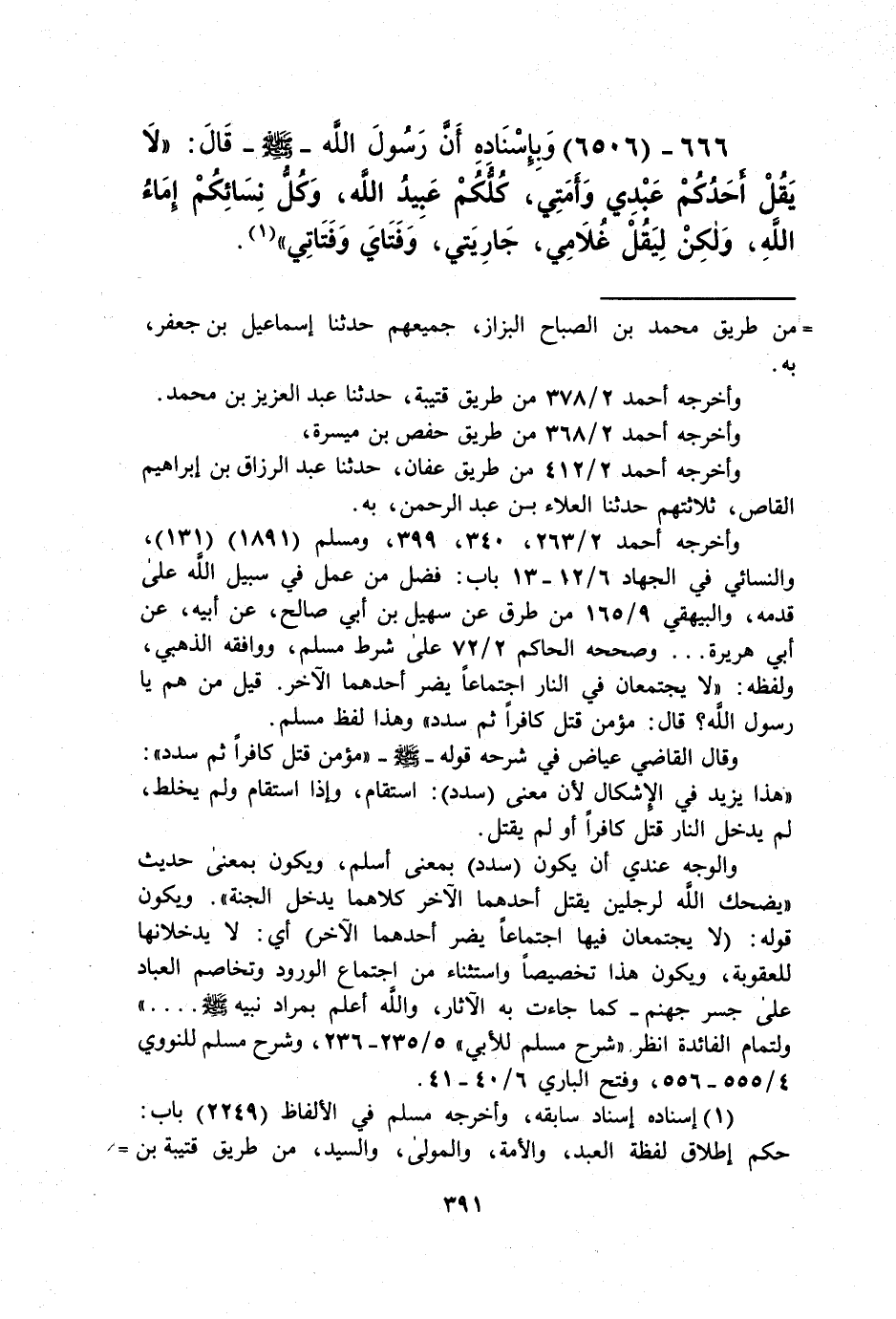 6506 - وَبِإِسْنَادِهِ أَنَّ رَسُولَ اللَّهِ صَلَّى اللهُ عَلَيْهِ وَسَلَّمَ قَالَ: " §لَا يَقُلْ أَحَدُكُمْ: عَبْدِي وَأَمَتِي كُلُّكُمْ عُبَيْدُ اللَّهِ وَكُلُّ نِسَائِكُمْ إِمَاءُ اللَّهِ، وَلَكِنْ لِيَقُلْ: غُلَامِي، جَارِيَتِي، وَفَتَايَ وَفَتَاتِي "Kإسناده صحيح