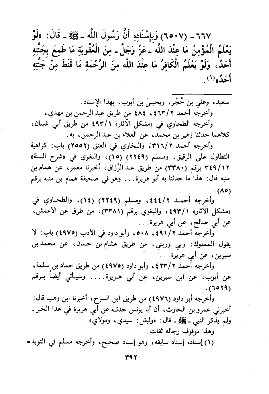 6507 - وَبِإِسْنَادِهِ أَنَّ رَسُولَ اللَّهِ صَلَّى اللهُ عَلَيْهِ وَسَلَّمَ قَالَ: «§لَوْ يَعْلَمُ الْمُؤْمِنُ مَا عِنْدَ اللَّهِ عَزَّ وَجَلَّ مِنَ الْعُقُوبَةِ مَا طَمَعَ بِجَنَّتِهِ أَحَدٌ، وَلَوْ يَعْلَمُ الْكَافِرُ مَا عِنْدَ اللَّهِ مِنَ الرَّحْمَةِ مَا قَنَطَ مِنْ جَنَّتِهِ أَحَدٌ» Kإسناده صحيح