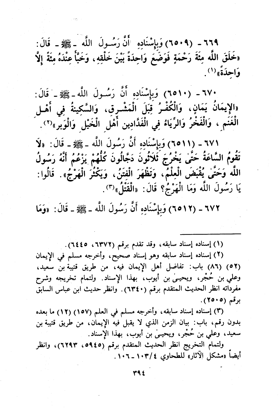 6511 - وَبِإِسْنَادِهِ أَنَّ رَسُولَ اللَّهِ صَلَّى اللهُ عَلَيْهِ وَسَلَّمَ قَالَ: «§لَا تَقُومُ السَّاعَةُ حَتَّى يَخْرُجَ ثَلَاثُونَ دَجَّالُونَ كُلُّهُمْ يَزْعُمُ أَنَّهُ رَسُولُ اللَّهِ، وَحَتَّى يُقْبَضَ الْعِلْمُ، وَتَظْهَرُ الْفِتَنُ، وَيَكْثُرُ الْهَرْجُ»، قَالُوا: يَا رَسُولَ اللَّهِ، وَمَا الْهَرْجُ؟ قَالَ: «الْقَتْلُ» Kإسناده صحيح