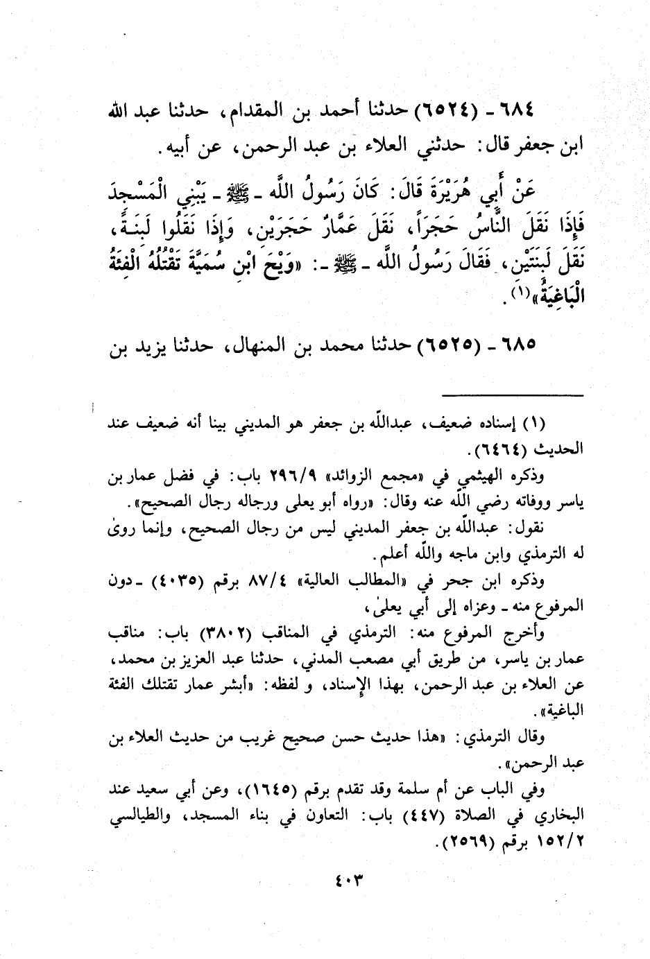 6524 - حَدَّثَنَا أَحْمَدُ بْنُ الْمِقْدَامِ، حَدَّثَنَا عَبْدُ اللَّهِ بْنُ جَعْفَرٍ قَالَ: حَدَّثَنِي الْعَلَاءُ بْنُ عَبْدِ الرَّحْمَنِ، عَنْ أَبِيهِ، عَنْ أَبِي هُرَيْرَةَ قَالَ: كَانَ رَسُولُ اللَّهِ صَلَّى اللهُ عَلَيْهِ وَسَلَّمَ يَبْنِي الْمَسْجِدَ، فَإِذَا نَقَلَ النَّاسُ حَجَرًا نَقَلَ عَمَّارٌ حَجَرَيْنِ، وَإِذَا نَقَلُوا لَبِنَةً، نَقَلَ لَبِنَتَيْنِ، فَقَالَ رَسُولُ اللَّهِ صَلَّى اللهُ عَلَيْهِ وَسَلَّمَ: «§وَيْحَ ابْنِ سُمَيَّةَ تَقْتُلُهُ الْفِئَةُ الْبَاغِيَةُ» Kإسناده ضعيف