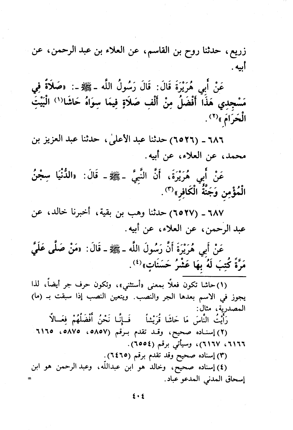 6526 - حَدَّثَنَا عَبْدُ الْأَعْلَى، حَدَّثَنَا عَبْدُ الْعَزِيزِ بْنُ مُحَمَّدٍ، عَنِ الْعَلَاءِ، عَنْ أَبِيهِ، عَنْ أَبِي هُرَيْرَةَ، أَنَّ النَّبِيَّ صَلَّى اللهُ عَلَيْهِ وَسَلَّمَ قَالَ: «§الدُّنْيَا سِجْنُ الْمُؤْمِنِ وَجَنَّةُ الْكَافِرِ» Kإسناده صحيح