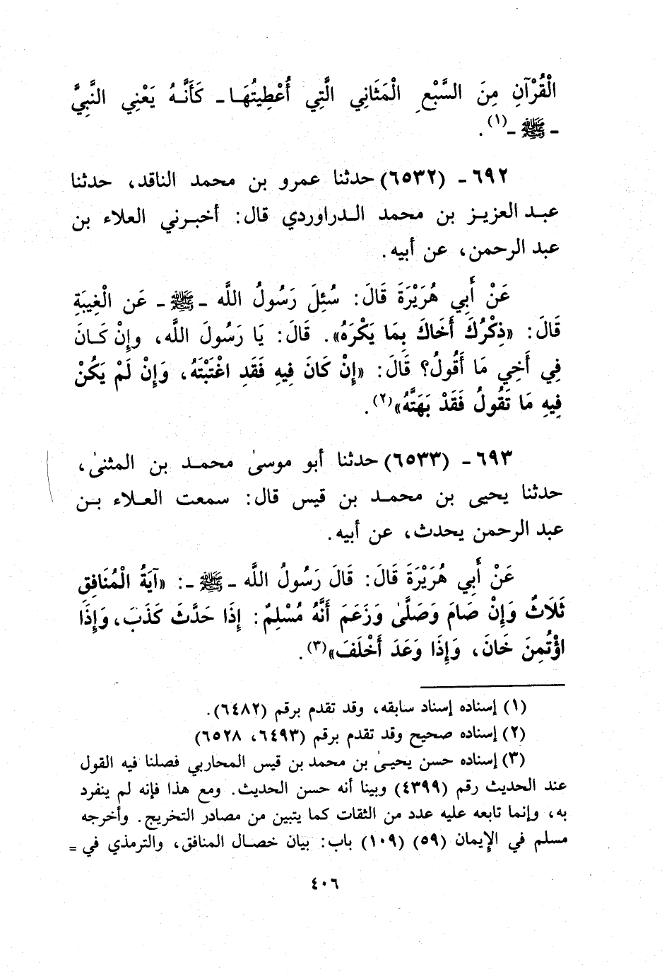 6532 - حَدَّثَنَا عَمْرُو بْنُ مُحَمَّدٍ النَّاقِدُ، حَدَّثَنَا عَبْدُ الْعَزِيزِ بْنُ مُحَمَّدٍ الدَّرَاوَرْدِيُّ قَالَ: أَخْبَرَنِي الْعَلَاءُ بْنُ عَبْدِ الرَّحْمَنِ، عَنْ أَبِيهِ، عَنْ أَبِي هُرَيْرَةَ قَالَ: سُئِلَ رَسُولُ اللَّهِ صَلَّى اللهُ عَلَيْهِ وَسَلَّمَ عَنِ §الْغِيبَةِ، قَالَ: «ذِكْرُكَ أَخَاكَ بِمَا يَكْرَهُ»، قَالَ: يَا رَسُولَ اللَّهِ، وَإِنْ كَانَ فِي أَخِي مَا أَقُولُ؟ قَالَ: «إِنْ كَانَ فِيهِ فَقَدِ اغْتَبْتَهُ، وَإِنْ لَمْ يَكُنْ فِيهِ مَا تَقُولُ فَقَدْ بَهَتَّهُ» Kإسناده صحيح