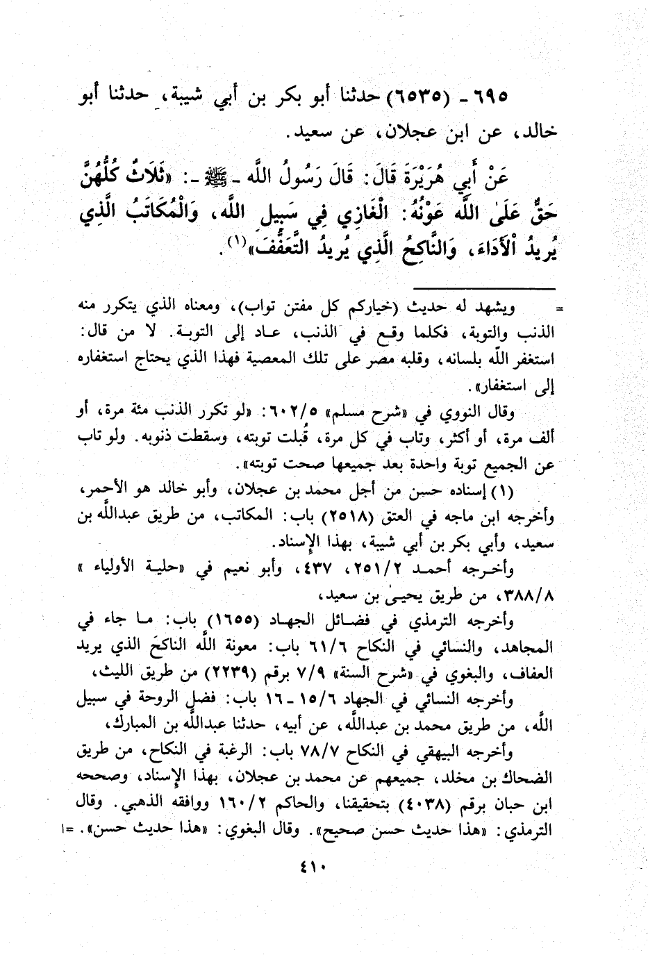6535 - حَدَّثَنَا أَبُو بَكْرِ بْنُ أَبِي شَيْبَةَ، حَدَّثَنَا أَبُو خَالِدٍ، عَنِ ابْنِ عَجْلَانَ، عَنْ سَعِيدٍ، عَنْ أَبِي هُرَيْرَةَ قَالَ: قَالَ رَسُولُ اللَّهِ صَلَّى اللهُ عَلَيْهِ وَسَلَّمَ: " §ثَلَاثٌ كُلُّهُنَّ حَقٌّ عَلَى اللَّهِ عَوْنُهُ: الْغَازِي فِي سَبِيلِ اللَّهِ، وَالْمُكَاتَبُ الَّذِي يُرِيدُ الْأَدَاءَ، وَالنَّاكِحُ الَّذِي يُرِيدُ التَّعَفُّفَ "Kإسناده حسن