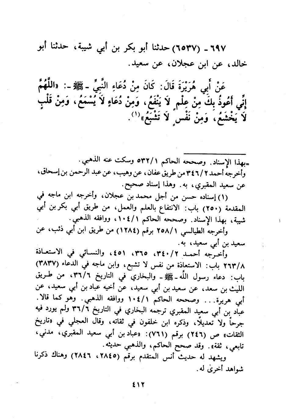 6537 - حَدَّثَنَا أَبُو بَكْرِ بْنُ أَبِي شَيْبَةَ، حَدَّثَنَا أَبُو خَالِدٍ، عَنِ ابْنِ عَجْلَانَ، عَنْ سَعِيدٍ، عَنْ أَبِي هُرَيْرَةَ قَالَ: كَانَ مِنْ دُعَاءِ النَّبِيِّ صَلَّى اللهُ عَلَيْهِ وَسَلَّمَ: «§اللَّهُمَّ إِنِّي أَعُوذُ بِكَ مِنْ عِلْمٍ لَا يَنْفَعُ، وَمِنْ دُعَاءٍ لَا يُسْمَعُ، وَمِنْ قَلْبٍ لَا يَخْشَعُ، وَمِنْ نَفْسٍ لَا تَشْبَعُ» Kإسناده حسن