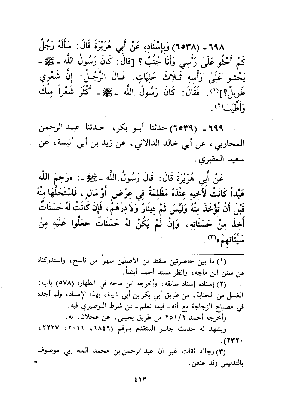 6538 - وَبِإِسْنَادِهِ، عَنْ أَبِي هُرَيْرَةَ قَالَ: سَأَلَهُ رَجُلٌ كَمْ أَحْثُو عَلَى رَأْسِي وَأَنَا جُنُبٌ؟ قَالَ: «كَانَ رَسُولُ اللَّهِ صَلَّى اللهُ عَلَيْهِ وَسَلَّمَ §يَحْثُو عَلَى رَأْسِهِ ثَلَاثَ حَثَيَاتٍ»، قَالَ الرَّجُلُ: إِنَّ شَعْرِي طَوِيلٌ؟ فَقَالَ: «كَانَ رَسُولُ اللَّهِ صَلَّى اللهُ عَلَيْهِ وَسَلَّمَ أَكْثَرَ شَعْرًا مِنْكَ وَأَطْيَبَ» Kإسناده حسن