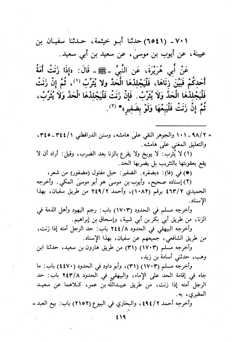 6541 - حَدَّثَنَا أَبُو خَيْثَمَةَ، حَدَّثَنَا سُفْيَانُ بْنُ عُيَيْنَةَ، عَنْ أَيُّوبَ بْنِ مُوسَى، عَنْ سَعِيدِ بْنِ أَبِي سَعِيدٍ، عَنْ أَبِي هُرَيْرَةَ، عَنِ النَّبِيِّ صَلَّى اللهُ عَلَيْهِ وَسَلَّمَ قَالَ: «§إِذَا زَنَتْ أَمَةُ أَحَدِكُمْ فَبَيَّنَ زِنَاهَا، فَلْيَجْلِدْهَا الْحَدَّ وَلَا يُثَرِّبْ، ثُمَّ إِنْ زَنَتْ، فَلْيَجْلِدْهَا الْحَدَّ وَلَا يُثَرِّبْ، فَإِنْ زَنَتْ فَلْيَجْلِدْهَا الْحَدَّ وَلَا يُثَرِّبْ، ثُمَّ إِنْ زَنَتْ فَلْيَبِعْهَا وَلَوْ بِضَفِيرٍ» Kإسناده صحيح