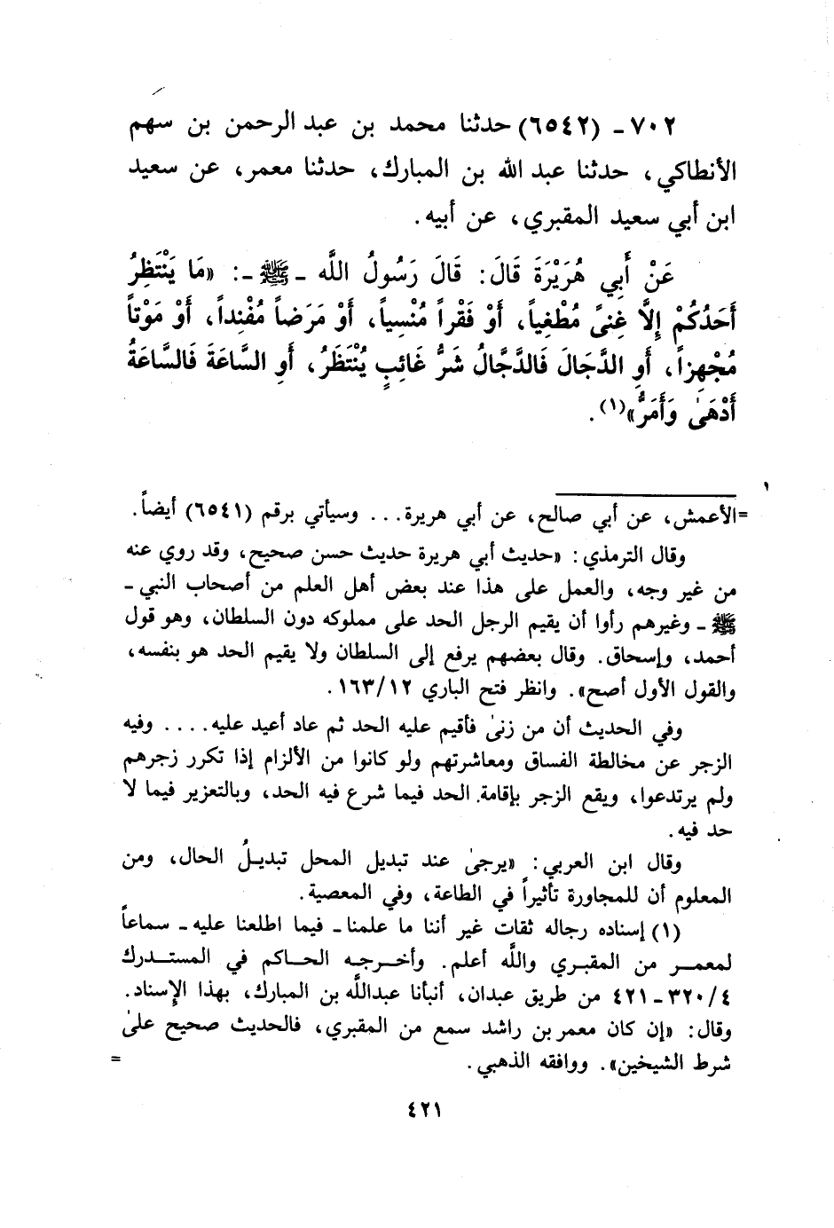 6542 - حَدَّثَنَا مُحَمَّدُ بْنُ عَبْدِ الرَّحْمَنِ بْنِ سَهْمٍ الْأَنْطَاكِيُّ، حَدَّثَنَا عَبْدُ اللَّهِ بْنُ الْمُبَارَكِ، حَدَّثَنَا مَعْمَرٌ، عَنْ سَعِيدِ بْنِ أَبِي سَعِيدٍ الْمَقْبُرِيِّ، عَنْ أَبِيهِ، عَنْ أَبِي هُرَيْرَةَ قَالَ: قَالَ رَسُولُ اللَّهِ صَلَّى اللهُ عَلَيْهِ وَسَلَّمَ: «§مَا يَنْتَظِرُ أَحَدُكُمْ إِلَّا غِنًى مُطْغِيًا، أَوْ فَقْرًا مُنْسِيًا، أَوْ مَرَضًا مُفَنِّدًا، أَوْ مَوْتًا مُجْهِزًا، أَوِ الدَّجَّالَ فَالدَّجَّالُ شَرُّ غَائِبٍ يُنْتَظَرُ، أَوِ السَّاعَةَ فَالسَّاعَةُ أَدْهَى وَأَمَرُّ» Kإسناده رجاله ثقات