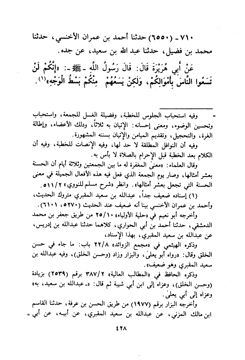 6550 - حَدَّثَنَا أَحْمَدُ بْنُ عِمْرَانَ الْأَخْنَسِيُّ، حَدَّثَنَا مُحَمَّدُ بْنُ فُضَيْلٍ، حَدَّثَنَا عَبْدُ اللَّهِ بْنُ سَعِيدٍ، عَنْ جَدِّهِ، عَنْ أَبِي هُرَيْرَةَ قَالَ: قَالَ رَسُولُ اللَّهِ صَلَّى اللهُ عَلَيْهِ وَسَلَّمَ: «§إِنَّكُمْ لَنْ تَسَعُوا النَّاسَ بِأَمْوَالِكُمْ، وَلَكِنْ يَسَعُهُمْ مِنْكُمْ بَسْطُ الْوَجْهِ» Kإسناده ضعيف جدا