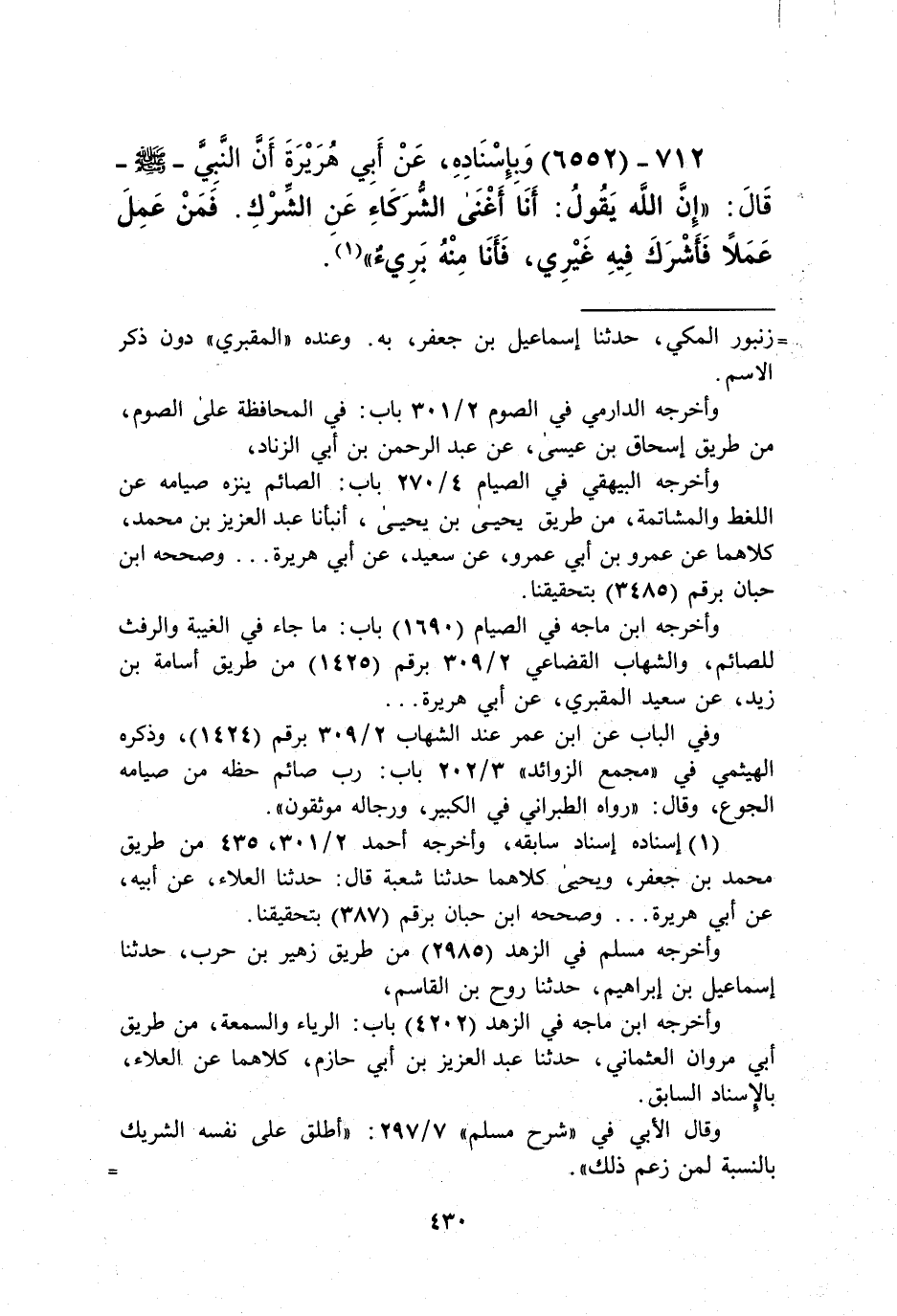 6552 - وَبِإِسْنَادِهِ عَنْ أَبِي هُرَيْرَةَ، أَنَّ النَّبِيَّ صَلَّى اللهُ عَلَيْهِ وَسَلَّمَ قَالَ: " إِنَّ اللَّهَ يَقُولُ: §أَنَا أَغْنَى الشُّرَكَاءِ عَنِ الشِّرْكِ، فَمَنْ عَمِلَ عَمَلًا فَأَشْرَكَ فِيهِ غَيْرِي، فَأَنَا مِنْهُ بَرِيءٌ "Kإسناده صحيح
