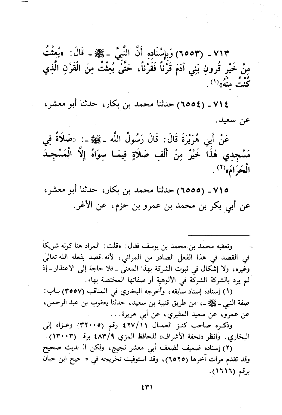 6554 - حَدَّثَنَا مُحَمَّدُ بْنُ بَكَّارٍ، حَدَّثَنَا أَبُو مَعْشَرٍ، عَنْ سَعِيدٍ، عَنْ أَبِي هُرَيْرَةَ قَالَ: قَالَ رَسُولُ اللَّهِ صَلَّى اللهُ عَلَيْهِ وَسَلَّمَ: «§صَلَاةٌ فِي مَسْجِدِي هَذَا خَيْرٌ مِنْ أَلْفِ صَلَاةٍ فِيمَا سِوَاهُ، إِلَّا الْمَسْجِدَ الْحَرَامَ» Kإسناده ضعيف
