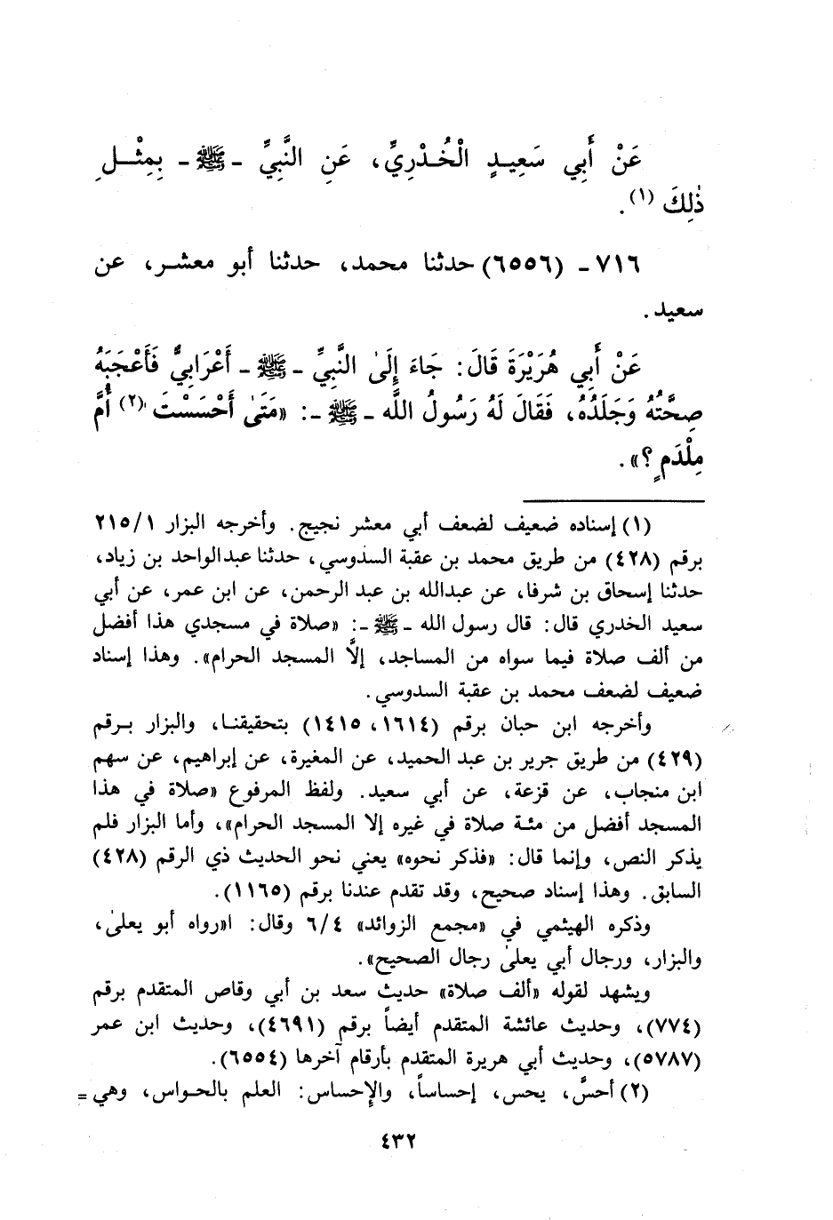 6556 - حَدَّثَنَا مُحَمَّدٌ، حَدَّثَنَا أَبُو مَعْشَرٍ، عَنْ سَعِيدٍ، عَنْ أَبِي هُرَيْرَةَ قَالَ: جَاءَ إِلَى النَّبِيِّ صَلَّى اللهُ عَلَيْهِ وَسَلَّمَ أَعْرَابِيٌّ فَأَعْجَبَهُ صِحَّتُهُ وَجَلَدُهُ فَقَالَ لَهُ رَسُولُ اللَّهِ صَلَّى اللهُ عَلَيْهِ وَسَلَّمَ: «مَتَى أَحْسَسْتَ أُمَّ مِلْدَمٍ؟» -[433]-، فَقَالَ الْأَعْرَابِيُّ: وَأَيُّ شَيْءٍ أُمُّ مِلْدَمٍ؟ قَالَ: «الْحُمَّى»، قَالَ: وَأَيُّ شَيْءٍ الْحُمَّى؟ فَقَالَ لَهُ رَسُولُ اللَّهِ صَلَّى اللهُ عَلَيْهِ وَسَلَّمَ: «سُخْنَةٌ تَكُونُ بَيْنَ الْجِلْدِ وَالْعَظْمِ»، فَقَالَ الْأَعْرَابِيُّ: مَا لِي بِذَلِكَ عَهْدٌ، قَالَ لَهُ: «فَمَتَى أَحْسَسْتَ بِالصُّدَاعِ؟»، قَالَ: وَأَيُّ شَيْءٍ الصُّدَاعُ؟ فَقَالَ لَهُ: «ضَرَبَانٌ يَكُونُ فِي الصُّدْغَيْنِ وَالرَّأْسِ»، فَقَالَ: مَا لِي بِذَلِكَ عَهْدٌ، قَالَ: فَلَمَّا وَلَّى الْأَعْرَابِيُّ، قَالَ رَسُولُ اللَّهِ صَلَّى اللهُ عَلَيْهِ وَسَلَّمَ: «§مَنْ سَرَّهُ أَنْ يَنْظُرَ إِلَى رَجُلٍ مِنْ أَهْلِ النَّارِ، فَلْيَنْظُرْ إِلَيْهِ»، يَعْنِي الْأَعْرَابِيَّKإسناده ضعيف