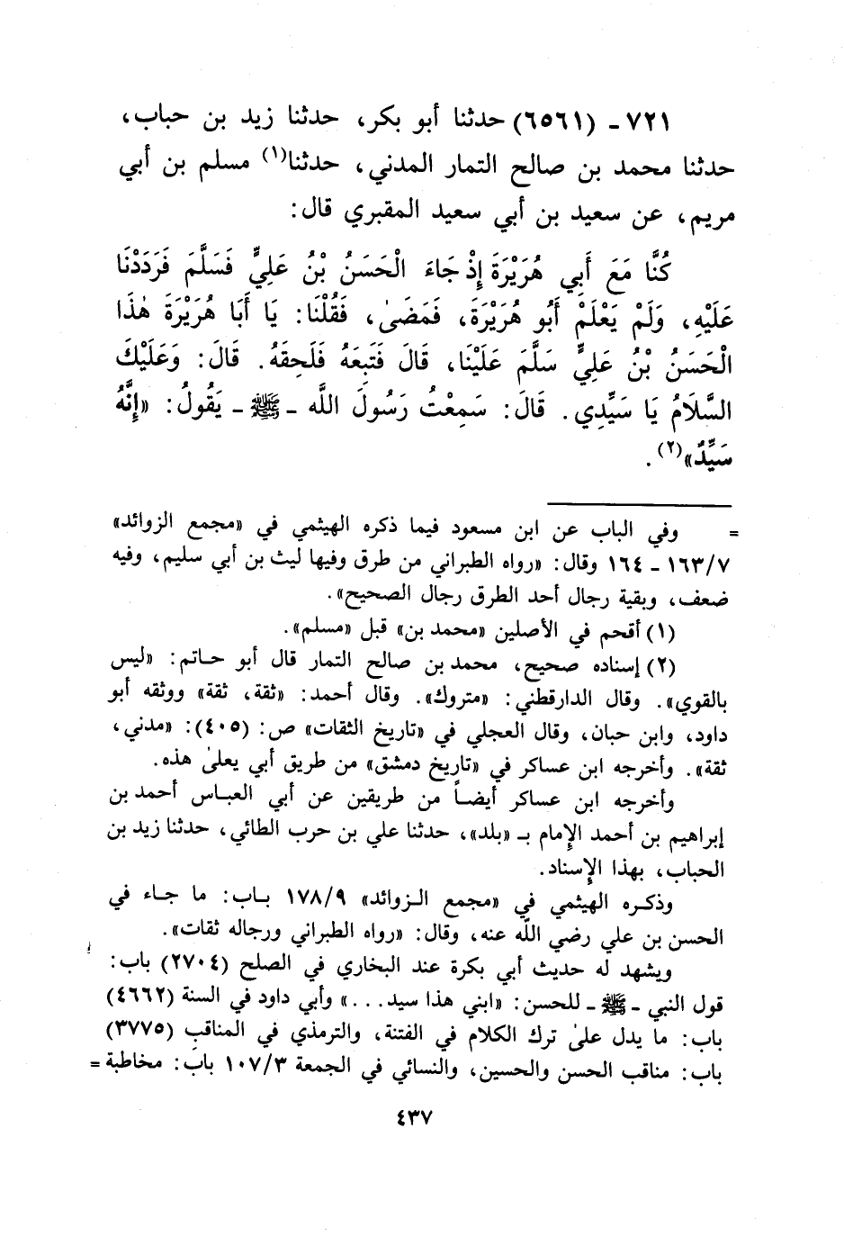 6561 - حَدَّثَنَا أَبُو بَكْرٍ، حَدَّثَنَا زَيْدُ بْنُ حُبَابٍ، حَدَّثَنَا مُحَمَّدُ بْنُ صَالِحٍ التَّمَّارُ الْمَدَنِيُّ، حَدَّثَنَا مُسْلِمُ بْنُ أَبِي مَرْيَمَ، عَنْ سَعِيدِ بْنِ أَبِي سَعِيدٍ الْمَقْبُرِيِّ قَالَ: كُنَّا مَعَ أَبِي هُرَيْرَةَ إِذْ جَاءَ الْحَسَنُ بْنُ عَلَيٍّ، فَسَلَّمَ فَرَدَدْنَا عَلَيْهِ، وَلَمْ يَعْلَمْ أَبُو هُرَيْرَةَ، فَمَضَى فَقُلْنَا: يَا أَبَا هُرَيْرَةَ هَذَا الْحَسَنُ بْنُ عَلَيٍّ سَلَّمَ عَلَيْنَا، قَالَ: فَتَبِعَهُ فَلَحِقَهُ قَالَ: وَعَلَيْكَ السَّلَامُ يَا سَيِّدِي، قَالَ: سَمِعْتُ رَسُولَ اللَّهِ صَلَّى اللهُ عَلَيْهِ وَسَلَّمَ §يَقُولُ: «إِنَّهُ سَيِّدٌ» Kإسناده صحيح