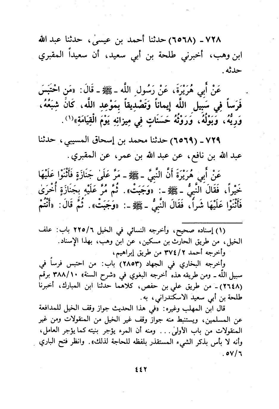 6568 - حَدَّثَنَا أَحْمَدُ بْنُ عِيسَى، حَدَّثَنَا عَبْدُ اللَّهِ بْنُ وَهْبٍ، أَخْبَرَنِي طَلْحَةُ بْنُ أَبِي سَعِيدٍ، أَنَّ سَعِيدًا الْمَقْبُرِيَّ، حَدَّثَهُ عَنْ أَبِي هُرَيْرَةَ، عَنْ رَسُولِ اللَّهِ صَلَّى اللهُ عَلَيْهِ وَسَلَّمَ قَالَ: «§مَنِ احْتَبَسَ فَرَسًا فِي سَبِيلِ اللَّهِ إِيمَانًا وَتَصْدِيقًا بِمَوْعِدِ اللَّهِ، كَانَ شِبَعُهُ، وَرِيُّهُ، وَبَوْلُهُ، وَرَوْثُهُ حَسَنَاتٍ فِي مِيزَانِهِ يَوْمَ الْقِيَامَةِ» Kإسناده صحيح