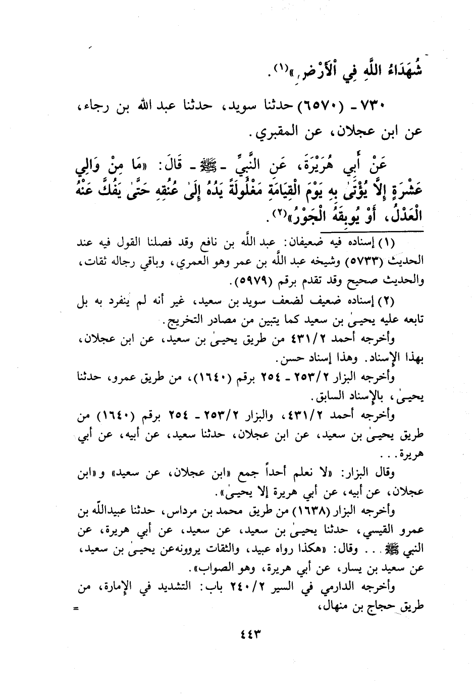 6570 - حَدَّثَنَا سُوَيْدٌ، حَدَّثَنَا عَبْدُ اللَّهِ بْنُ رَجَاءٍ، عَنِ ابْنِ عَجْلَانَ، عَنِ الْمَقْبُرِيِّ، عَنْ أَبِي هُرَيْرَةَ، عَنِ النَّبِيِّ صَلَّى اللهُ عَلَيْهِ وَسَلَّمَ قَالَ: «§مَا مِنْ وَالِي عَشْرَةٍ إِلَّا يُؤْتَى بِهِ يَوْمَ الْقِيَامَةِ مَغْلُولٌ يَدُهُ إِلَى عُنُقِهِ حَتَّى يَفُكَّ عَنْهُ الْعَدْلُ، أَوْ يُوبِقَهُ الْجَوْرُ» Kإسناده ضعيف