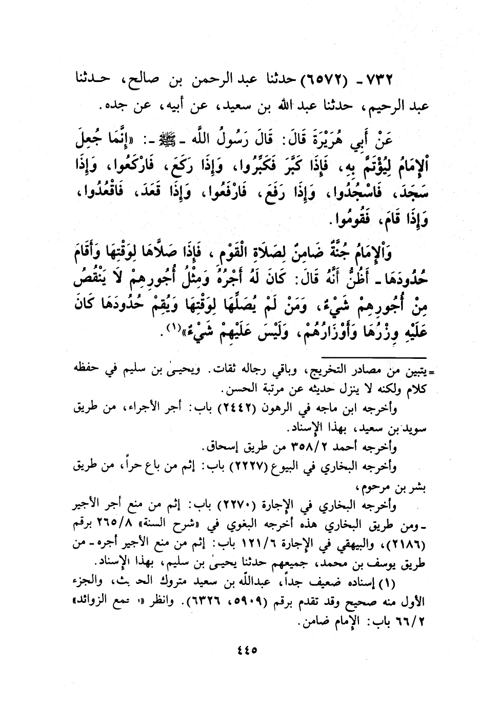 6572 - حَدَّثَنَا عَبْدُ الرَّحْمَنِ بْنُ صَالِحٍ، حَدَّثَنَا عَبْدُ الرَّحِيمِ، حَدَّثَنَا عَبْدُ اللَّهِ بْنُ سَعِيدٍ، عَنْ أَبِيهِ، عَنْ جَدِّهِ، عَنْ أَبِي هُرَيْرَةَ قَالَ: قَالَ رَسُولُ اللَّهِ صَلَّى اللهُ عَلَيْهِ وَسَلَّمَ: " §إِنَّمَا جُعِلَ الْإِمَامُ لِيُؤْتَمَّ بِهِ، فَإِذَا كَبَّرَ فَكَبِّرُوا، وَإِذَا رَكَعَ فَارْكَعُوا، وَإِذَا سَجَدَ فَاسْجُدُوا، وَإِذَا رَفَعَ فَارْفَعُوا، وَإِذَا قَعَدَ فَاقْعُدُوا، وَإِذَا قَامَ فَقُومُوا، وَالْإِمَامُ جُنَّةٌ ضَامِنٌ لِصَلَاةِ الْقَوْمِ، فَإِذَا صَلَّاهَا لِوَقْتِهَا وَأَقَامَ حُدُودَهَا - أَظُنُّ أَنَّهُ قَالَ: - كَانَ لَهُ أَجْرُهُ وَمِثْلُ أُجُورِهِمْ لَا يَنْقُصُ مِنْ أُجُورِهِمْ شَيْءٌ، وَمَنْ لَمْ يُصَلِّهَا لِوَقْتِهَا وَيُقِمْ حُدُودَهَا كَانَ عَلَيْهِ وِزْرُهَا وَأَوْزَارُهُمْ، وَلَيْسَ عَلَيْهِمْ شَيْءٌ "Kإسناده ضعيف جدا