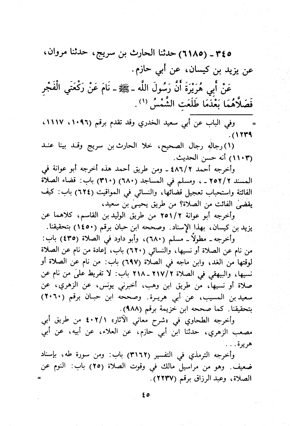 6185 - حَدَّثَنَا الْحَارِثُ بْنُ سُرَيْجٍ، حَدَّثَنَا مَرْوَانُ، عَنْ يَزِيدَ بْنِ كَيْسَانَ، عَنْ أَبِي حَازِمٍ، عَنْ أَبِي هُرَيْرَةَ، «أَنَّ رَسُولَ اللَّهِ صَلَّى اللهُ عَلَيْهِ وَسَلَّمَ §نَامَ عَنْ رَكْعَتَيِ الْفَجْرِ فَصَلَّاهُمَا بَعْدَمَا طَلَعَتِ الشَّمْسُ» Kرجاله رجال الصحيح