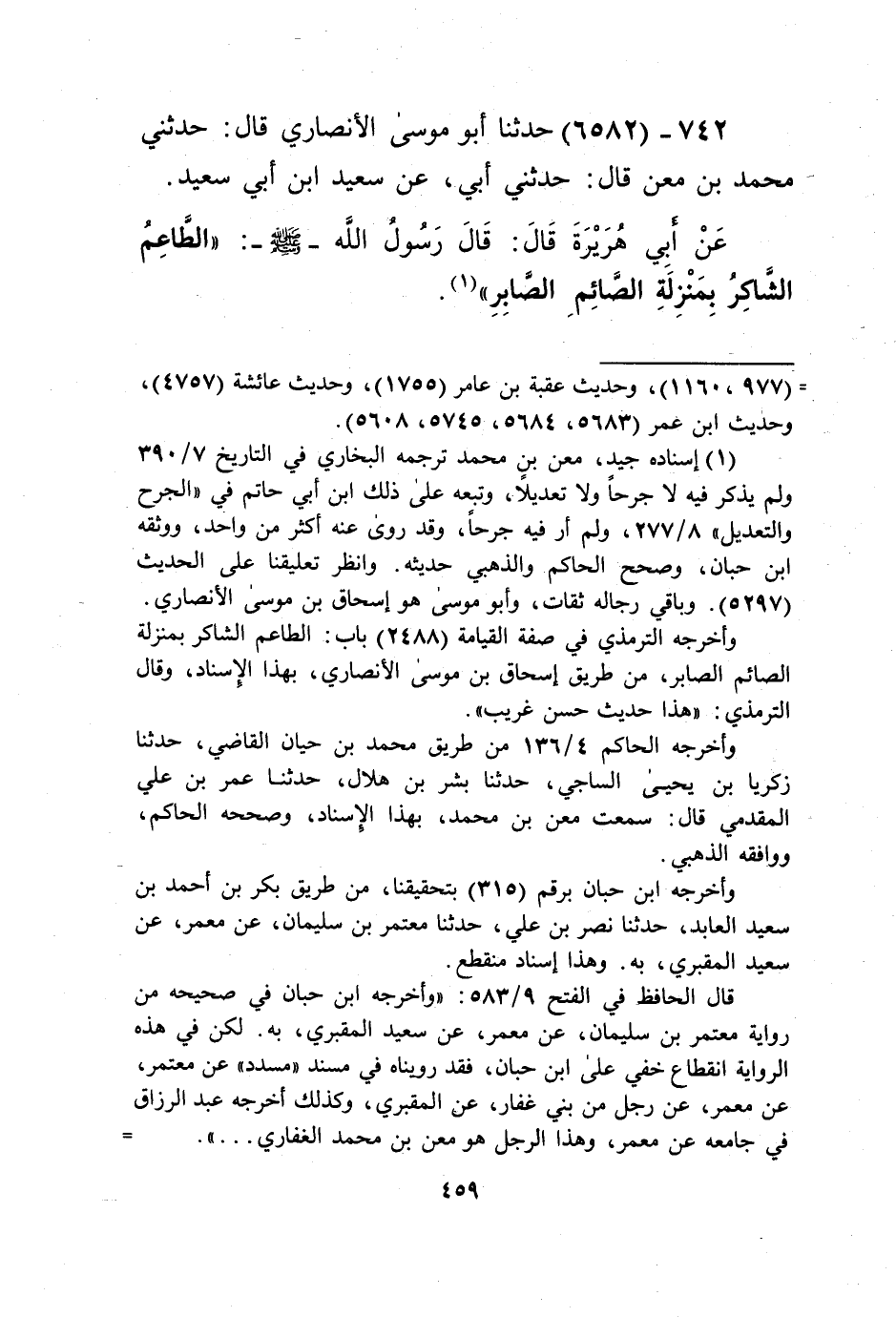 6582 - حَدَّثَنَا أَبُو مُوسَى الْأَنْصَارِيُّ قَالَ: حَدَّثَنِي مُحَمَّدُ بْنُ مَعْنٍ قَالَ: حَدَّثَنِي أَبِي، عَنْ سَعِيدِ بْنِ أَبِي سَعِيدٍ، عَنْ أَبِي هُرَيْرَةَ قَالَ: قَالَ رَسُولُ اللَّهِ صَلَّى اللهُ عَلَيْهِ وَسَلَّمَ: «§الطَّاعِمُ الشَّاكِرُ بِمَنْزِلَةِ الصَّائِمِ الصَّابِرِ» Kإسناده جيد