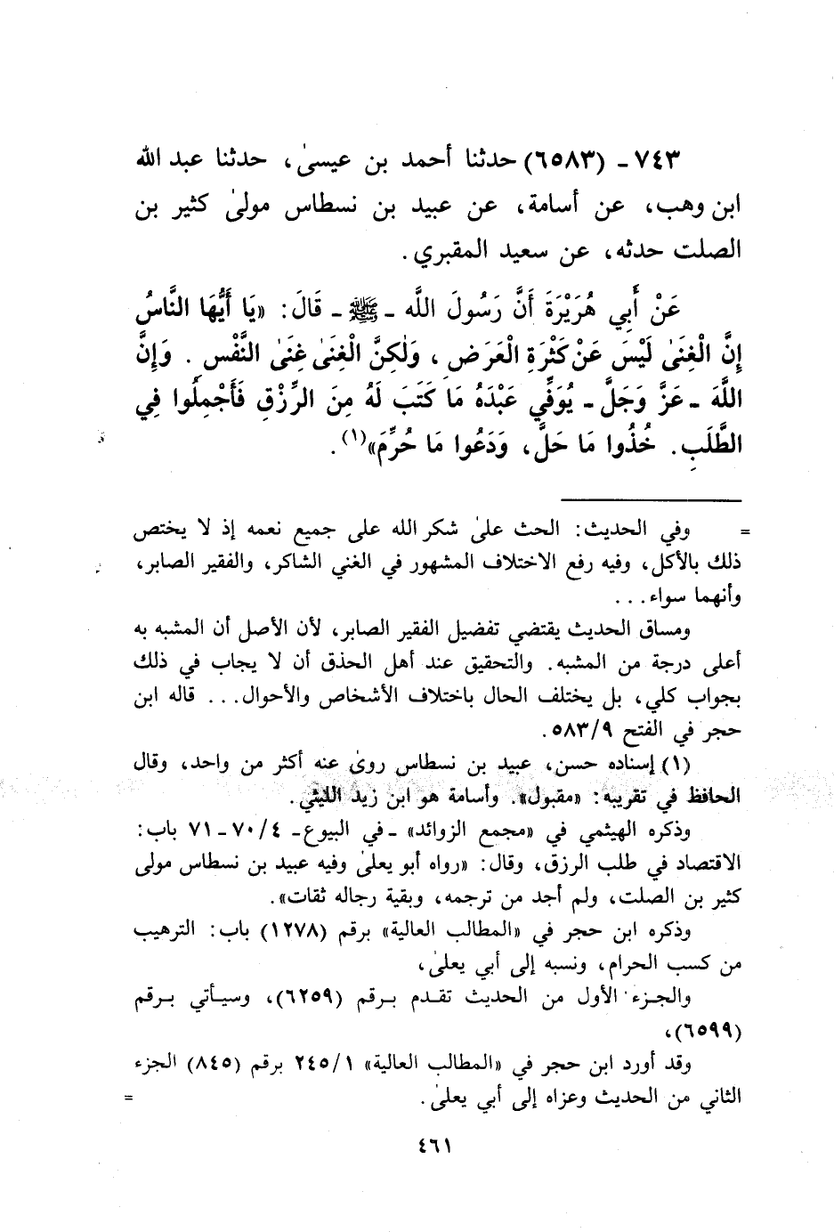 6583 - حَدَّثَنَا أَحْمَدُ بْنُ عِيسَى، حَدَّثَنَا عَبْدُ اللَّهِ بْنُ وَهْبٍ، عَنْ أُسَامَةَ، عَنْ عُبَيْدِ بْنِ نِسْطَاسٍ، مَوْلَى كَثِيرِ بْنِ الصَّلْتِ، حَدَّثَهُ عَنْ سَعِيدٍ الْمَقْبُرِيِّ، عَنْ أَبِي هُرَيْرَةَ، أَنَّ رَسُولَ اللَّهِ صَلَّى اللهُ عَلَيْهِ وَسَلَّمَ قَالَ: «يَا أَيُّهَا النَّاسُ، إِنَّ §الْغِنَى لَيْسَ عَنْ كَثْرَةِ الْعَرَضِ، وَلَكِنَّ الْغِنَى غِنَى النَّفْسِ، وَإِنَّ اللَّهَ عَزَّ وَجَلَّ يُوَفِّي عَبْدَهُ مَا كَتَبَ لَهُ مِنَ الرِّزْقِ فَأَجْمِلُوا فِي الطَّلَبِ، خُذُوا مَا حَلَّ، وَدَعَوْا مَا حُرِّمَ» Kإسناده حسن