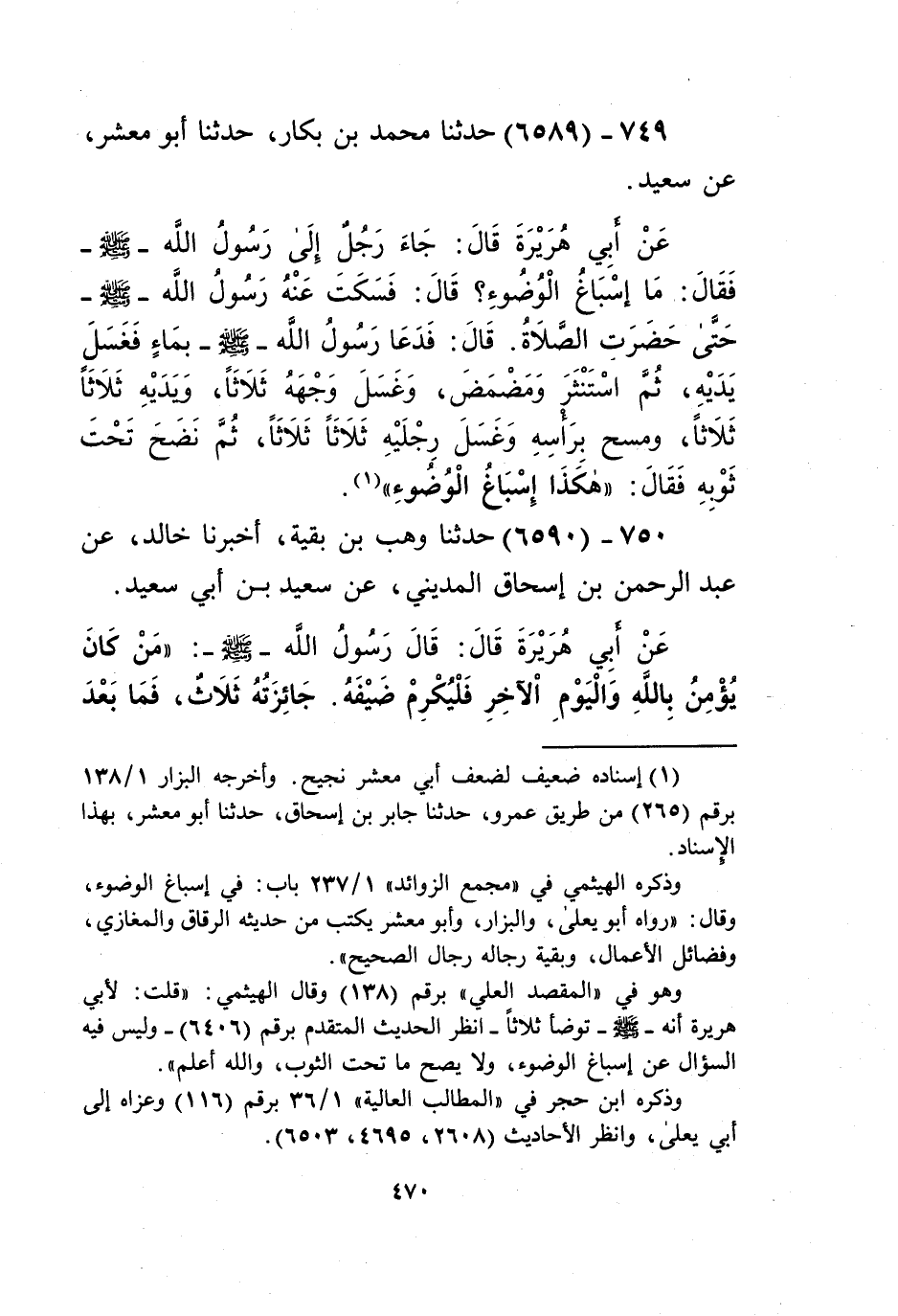 6589 - حَدَّثَنَا مُحَمَّدُ بْنُ بَكَّارٍ، حَدَّثَنَا أَبُو مَعْشَرٍ، عَنْ سَعِيدٍ، عَنْ أَبِي هُرَيْرَةَ قَالَ: جَاءَ رَجُلٌ إِلَى رَسُولِ اللَّهِ صَلَّى اللهُ عَلَيْهِ وَسَلَّمَ فَقَالَ: مَا إِسْبَاغُ الْوُضُوءِ؟ قَالَ: فَسَكَتَ عَنْهُ رَسُولُ اللَّهِ صَلَّى اللهُ عَلَيْهِ وَسَلَّمَ حَتَّى حَضَرَتِ الصَّلَاةُ، قَالَ: فَدَعَا رَسُولُ اللَّهِ صَلَّى اللهُ عَلَيْهِ وَسَلَّمَ بِمَاءٍ §فَغَسَلَ يَدَيْهِ، ثُمَّ اسْتَنْثَرَ وَمَضْمَضَ وَغَسَلَ وَجْهَهُ ثَلَاثًا، وَيَدَيْهِ ثَلَاثًا ثَلَاثًا، وَمَسَحَ بِرَأْسِهِ، وَغَسَلَ رِجْلَيْهِ ثَلَاثًا ثَلَاثًا، ثُمَّ نَضَحَ تَحْتَ ثَوْبِهِ، فَقَالَ: «هَكَذَا إِسْبَاغُ الْوُضُوءِ» Kإسناده ضعيف