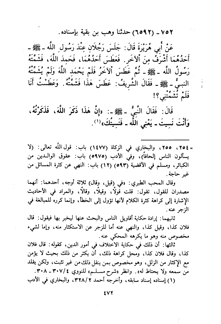 6592 - حَدَّثَنَا وَهْبُ بْنُ بَقِيَّةَ، بِإِسْنَادِهِ، عَنْ أَبِي هُرَيْرَةَ قَالَ: جَلَسَ رَجُلَانِ عِنْدَ رَسُولِ اللَّهِ صَلَّى اللهُ عَلَيْهِ وَسَلَّمَ أَحَدُهُمَا أَشْرَفُ مِنَ الْآخَرِ، فَعَطَسَ أَحَدُهُمَا فَحَمِدَ اللَّهَ، فَشَمَّتَّهُ رَسُولُ اللَّهِ صَلَّى اللهُ عَلَيْهِ وَسَلَّمَ، ثُمَّ عَطَسَ الْآخَرُ فَلَمْ يَحْمَدِ اللَّهَ، وَلَمْ يُشَمِّتْهُ النَّبِيُّ صَلَّى اللهُ عَلَيْهِ وَسَلَّمَ، فَقَالَ الشَّرِيفُ: عَطَسَ هَذَا فَشَمَّتَّهُ، وَعَطَسْتُ أَنَا فَلَمْ تُشَمِّتْنِي، قَالَ: فَقَالَ النَّبِيُّ صَلَّى اللهُ عَلَيْهِ وَسَلَّمَ: «§إِنَّ هَذَا ذَكَرَ اللَّهَ فَذَكَرْتُهُ، وَأَنْتَ نَسِيتَ - يَعْنِي اللَّهَ - فَنَسِيتُكَ» Kإسناده صحيح