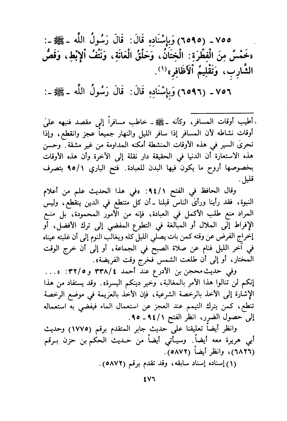 6595 - وَبِإِسْنَادِهِ قَالَ: قَالَ رَسُولُ اللَّهِ صَلَّى اللهُ عَلَيْهِ وَسَلَّمَ: " §خَمْسٌ مِنَ الْفِطْرَةِ: الْخِتَانُ، وَحَلْقُ الْعَانَةِ، وَنَتْفُ الْإِبْطِ، وَقَصُّ الشَّارِبِ، وَتَقْلِيمُ الْأَظَافِرِ "Kإسناده صحيح