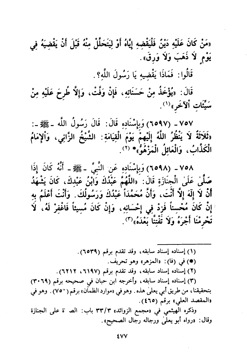 6597 - وَبِإِسْنَادِهِ قَالَ: قَالَ رَسُولُ اللَّهِ صَلَّى اللهُ عَلَيْهِ وَسَلَّمَ: " §ثَلَاثَةٌ لَا يَنْظُرُ اللَّهُ إِلَيْهِمْ يَوْمَ الْقِيَامَةِ: الشَّيْخُ الزَّانِي، وَالْإِمَامُ الْكَذَّابُ، وَالْعَائِلُ الْمَزْهُوُّ "Kإسناده صحيح