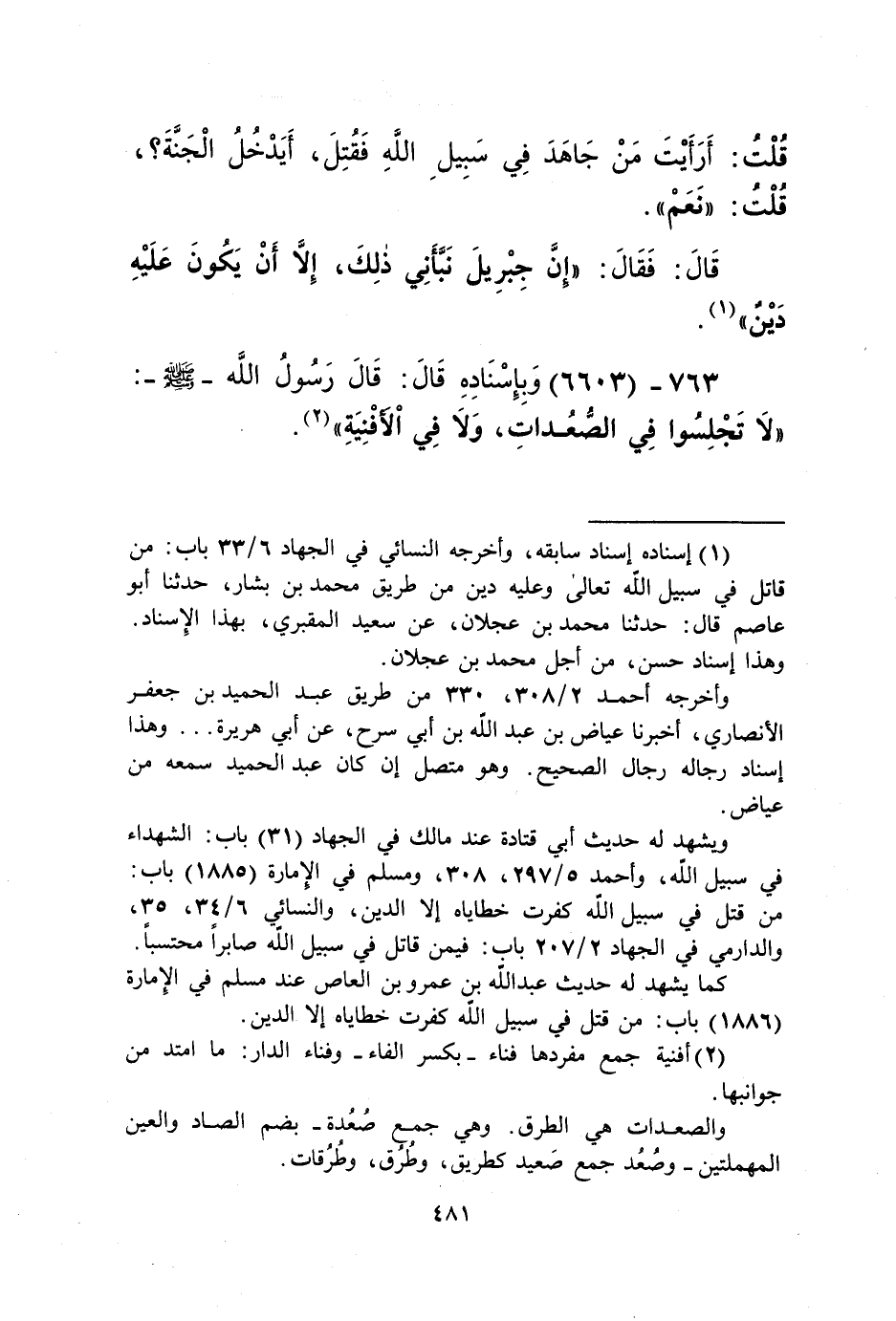 6603 - وَبِإِسْنَادِهِ قَالَ: قَالَ رَسُولُ اللَّهِ صَلَّى اللهُ عَلَيْهِ وَسَلَّمَ: «§لَا تَجْلِسُوا فِي الصُّعُدَاتِ وَلَا فِي الْأَفْنِيَةِ»، قَالُوا: يَا رَسُولَ اللَّهِ، لَا نَسْتَطِيعُ ذَلِكَ قَالَ: «إِمَّا لَا فَأَعْطُوهَا حَقَّهَا»، قَالُوا: يَا نَبِيَّ اللَّهِ، وَمَا حَقُّهَا؟ قَالَ: «رَدُّ التَّحِيَّةِ، وَغَضُّ الْبَصَرِ، وَتَشْمِيتُ الْعَاطِسِ، وَإِرْشَادُ السَّبِيلِ» Kإسناده صحيح