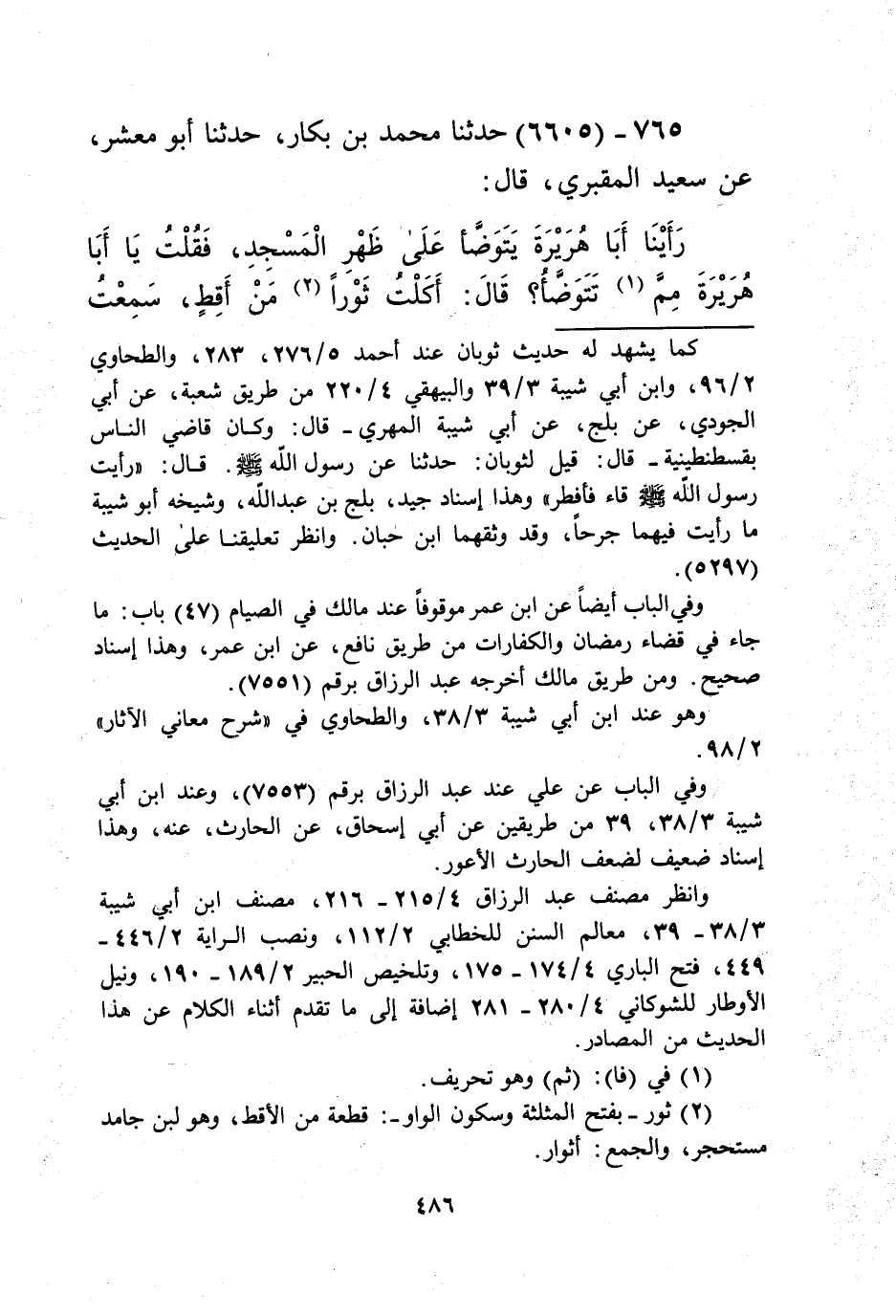 6605 - حَدَّثَنَا مُحَمَّدُ بْنُ بَكَّارٍ، حَدَّثَنَا أَبُو مَعْشَرٍ، عَنْ سَعِيدٍ الْمَقْبُرِيِّ قَالَ: رَأَيْنَا أَبَا هُرَيْرَةَ يَتَوَضَّأُ عَلَى ظَهْرِ الْمَسْجِدِ، فَقُلْتُ: يَا أَبَا هُرَيْرَةَ مِمَّ تَتَوَضَّأُ؟ قَالَ: أَكَلْتُ ثَوْرًا مِنْ أَقِطٍ سَمِعْتُ رَسُولَ اللَّهِ صَلَّى اللهُ عَلَيْهِ وَسَلَّمَ يَقُولُ: «§تَوَضَّئُوا مِمَّا غَيَّرَتِ النَّارُ» Kإسناده ضعيف