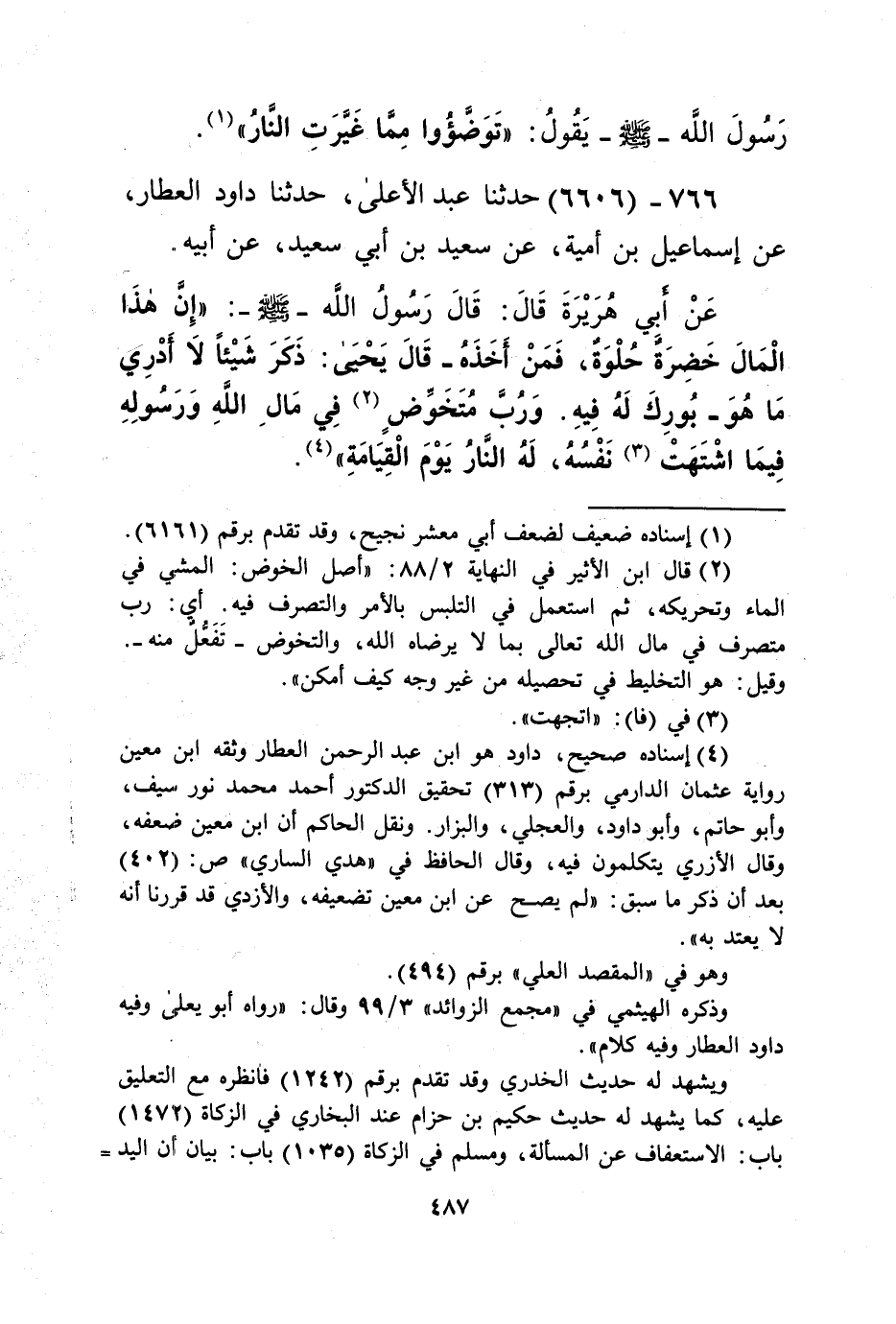 6606 - حَدَّثَنَا عَبْدُ الْأَعْلَى، حَدَّثَنَا دَاوُدُ الْعَطَّارُ، عَنْ إِسْمَاعِيلَ بْنِ أُمَيَّةَ، عَنْ سَعِيدِ بْنِ أَبِي سَعِيدٍ، عَنْ أَبِيهِ، عَنْ أَبِي هُرَيْرَةَ قَالَ: قَالَ رَسُولُ اللَّهِ صَلَّى اللهُ عَلَيْهِ وَسَلَّمَ: " §إِنَّ هَذَا الْمَالَ خَضِرَةٌ حُلْوَةٌ فَمَنْ أَخَذَهُ - قَالَ يَحْيَى: ذَكَرَ شَيْئًا لَا أَدْرِي مَا هُوَ - بُورِكَ لَهُ فِيهِ، وَرُبَّ مُتَخَوِّضٍ فِي مَالِ اللَّهِ وَرَسُولِهِ فِيمَا اشْتَهَتْ نَفْسُهُ، لَهُ النَّارُ يَوْمَ الْقِيَامَةِ "Kإسناده صحيح