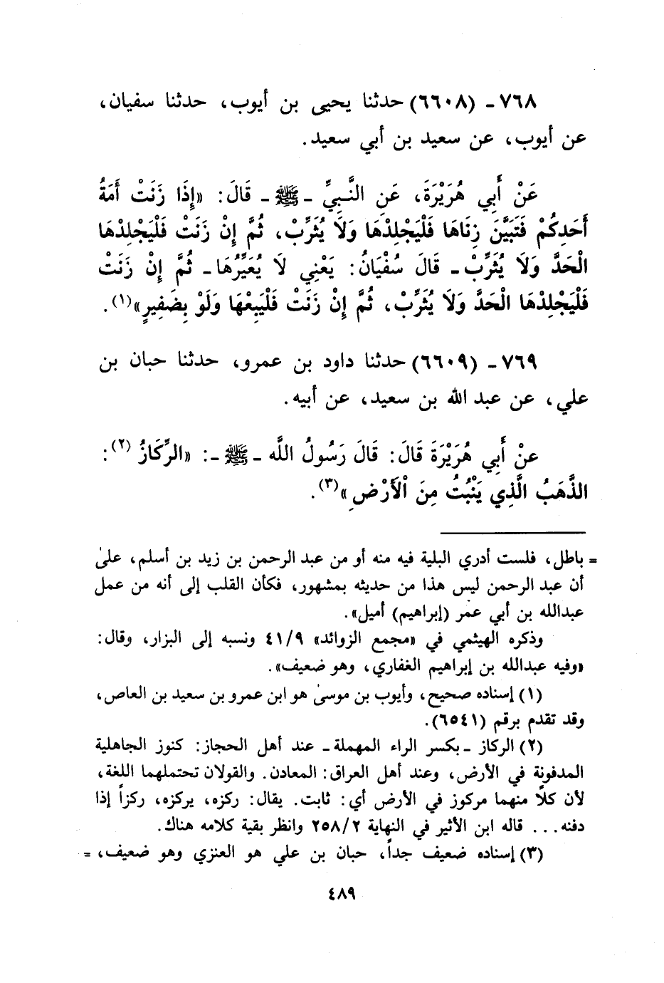 6609 - حَدَّثَنَا دَاوُدُ بْنُ عَمْرٍو، حَدَّثَنَا حِبَّانُ بْنُ عَلِيٍّ، عَنْ عَبْدِ اللَّهِ بْنِ سَعِيدٍ، عَنْ أَبِيهِ، عَنْ أَبِي هُرَيْرَةَ قَالَ: قَالَ رَسُولُ اللَّهِ صَلَّى اللهُ عَلَيْهِ وَسَلَّمَ: «§الرِّكَازُ الذَّهَبُ الَّذِي يَنْبُتُ مِنَ الْأَرْضِ» Kإسناده ضعيف جدا