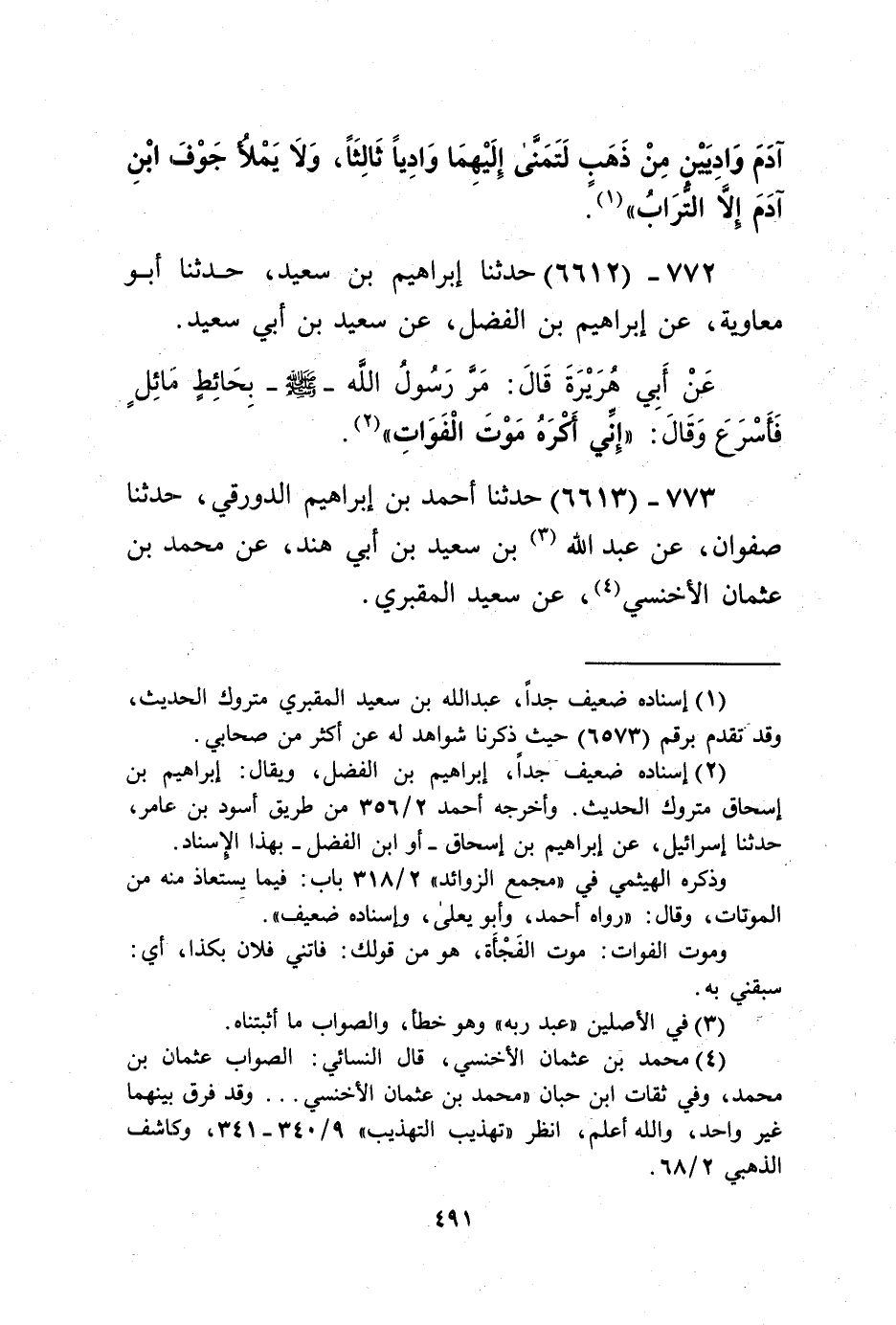 6612 - حَدَّثَنَا إِبْرَاهِيمُ بْنُ سَعِيدٍ، حَدَّثَنَا أَبُو مُعَاوِيَةَ، عَنْ إِبْرَاهِيمَ بْنِ الْفَضْلِ، عَنْ سَعِيدِ بْنِ أَبِي سَعِيدٍ، عَنْ أَبِي هُرَيْرَةَ قَالَ: مَرَّ رَسُولُ اللَّهِ صَلَّى اللهُ عَلَيْهِ وَسَلَّمَ بِحَائِطٍ مَائِلٍ فَأَسْرَعَ وَقَالَ: «§إِنِّي أَكْرَهُ مَوْتَ الْفَوَاتِ» Kإسناده ضعيف جدا