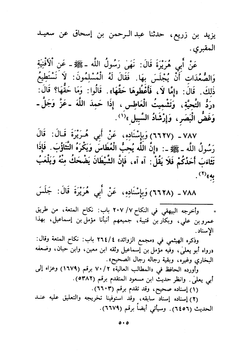 6628 - وَبِإِسْنَادِهِ، عَنْ أَبِي هُرَيْرَةَ قَالَ: جَلَسَ رَجُلَانِ عِنْدَ رَسُولِ اللَّهِ صَلَّى اللهُ عَلَيْهِ وَسَلَّمَ أَحَدُهُمَا أَشْرَفُ مِنَ الْآخَرِ، §فَعَطَسَ الشَّرِيفُ مِنْهُمَا فَلَمْ يَحْمَدِ اللَّهَ «فَلَمْ يُشَمِّتْهُ»، وَعَطَسَ الْآخَرُ فَحَمِدَ اللَّهَ «فَشَمَّتَّهُ» Kإسناده صحيح