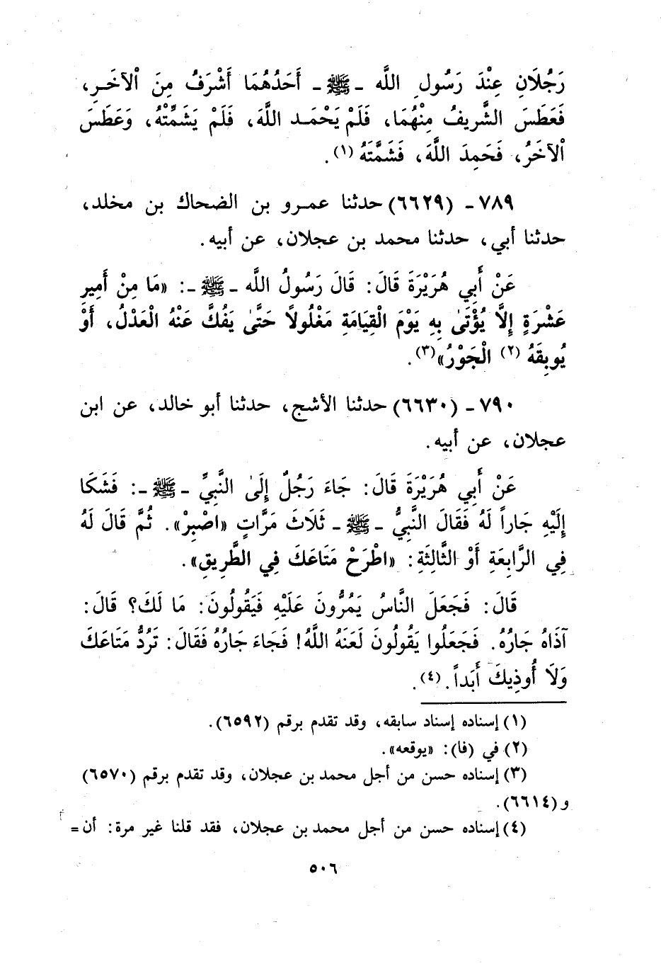 6630 - حَدَّثَنَا الْأَشَجُّ، حَدَّثَنَا أَبُو خَالِدٍ، عَنِ ابْنِ عَجْلَانَ، عَنْ أَبِيهِ، عَنْ أَبِي هُرَيْرَةَ قَالَ: جَاءَ رَجُلٌ إِلَى النَّبِيِّ صَلَّى اللهُ عَلَيْهِ وَسَلَّمَ فَشَكَا إِلَيْهِ جَارًا لَهُ، فَقَالَ النَّبِيُّ صَلَّى اللهُ عَلَيْهِ وَسَلَّمَ ثَلَاثَ مَرَّاتٍ: «§اصْبِرْ»، ثُمَّ قَالَ لَهُ فِي الرَّابِعَةِ - أَوِ الثَّالِثَةِ -: «اطْرَحْ مَتَاعَكَ فِي الطَّرِيقِ»، قَالَ: فَجَعَلَ النَّاسُ يَمُرُّونَ عَلَيْهِ فَيَقُولُونَ: مَا لَكَ؟ قَالَ: آذَاهُ جَارُهُ، فَجَعَلُوا يَقُولُونَ: لَعَنَهُ اللَّهُ، فَجَاءَ جَارُهُ، فَقَالَ: تَرُدُّ مَتَاعَكَ وَلَا أُوذِيكَ أَبَدًاKإسناده حسن
