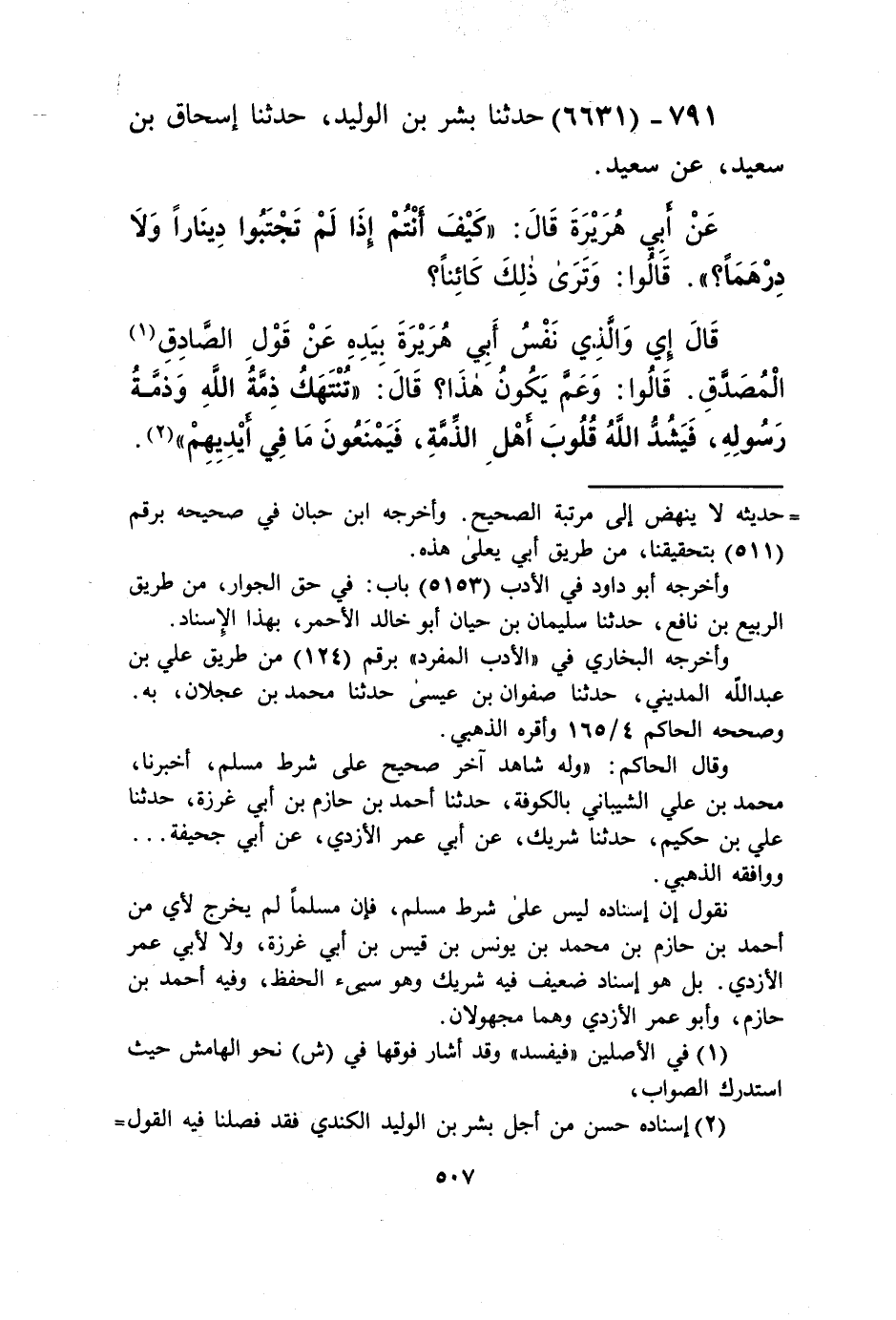 6631 - حَدَّثَنَا بِشْرُ بْنُ الْوَلِيدِ، حَدَّثَنَا إِسْحَاقُ بْنُ سَعِيدٍ، عَنْ سَعِيدٍ، عَنْ أَبِي هُرَيْرَةَ قَالَ: «§كَيْفَ أَنْتُمْ إِذَا لَمْ تَجْتَبُوا دِينَارًا وَلَا دِرْهَمًا؟»، قَالُوا: وَتَرَى ذَلِكَ كَائِنًا؟ قَالَ: إِي وَالَّذِي نَفْسُ أَبِي هُرَيْرَةَ بِيَدِهِ عَنْ قَوْلِ الصَّادِقِ الْمُصَدَّقِ، قَالُوا: وَعَمَّ يَكُونُ هَذَا؟ قَالَ: «تُنْتَهَكُ ذِمَّةُ اللَّهِ وَذِمَّةُ رَسُولِهِ، فَيَشُدُّ اللَّهُ قُلُوبَ أَهْلِ الذِّمَّةِ، فَيَمْنَعُونَ مَا فِي أَيْدِيِهِمْ» Kإسناده حسن
