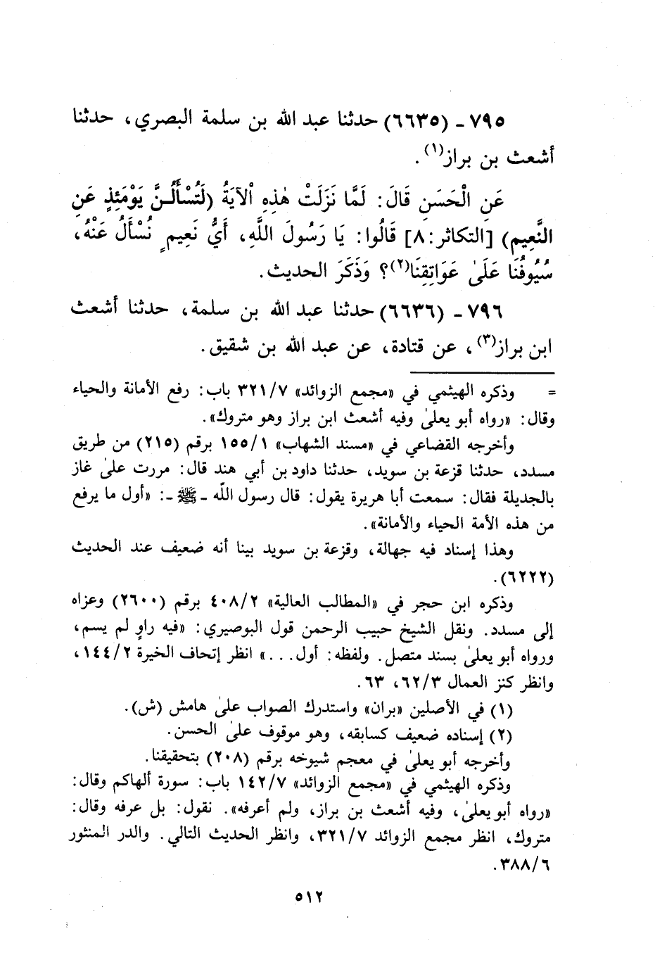 6635 - حَدَّثَنَا عَبْدُ اللَّهِ بْنُ سَلَمَةَ الْبَصْرِيُّ، حَدَّثَنَا أَشْعَثُ بْنُ بَرَّازٍ، عَنِ الْحَسَنِ قَالَ: لَمَّا نَزَلَتْ هَذِهِ الْآيَةُ: {لَتُسْأَلُنَّ يَوْمَئِذٍ عَنِ النَّعِيمِ} [التكاثر: 8] قَالُوا: يَا رَسُولَ اللَّهِ، §أَيُّ نَعِيمٍ نُسْأَلُ عَنْهُ؟ سُيُوفُنَا عَلَى عَوَاتِقِنَا وَذَكَرَ الْحَدِيثَ، Kإسناده ضعيف