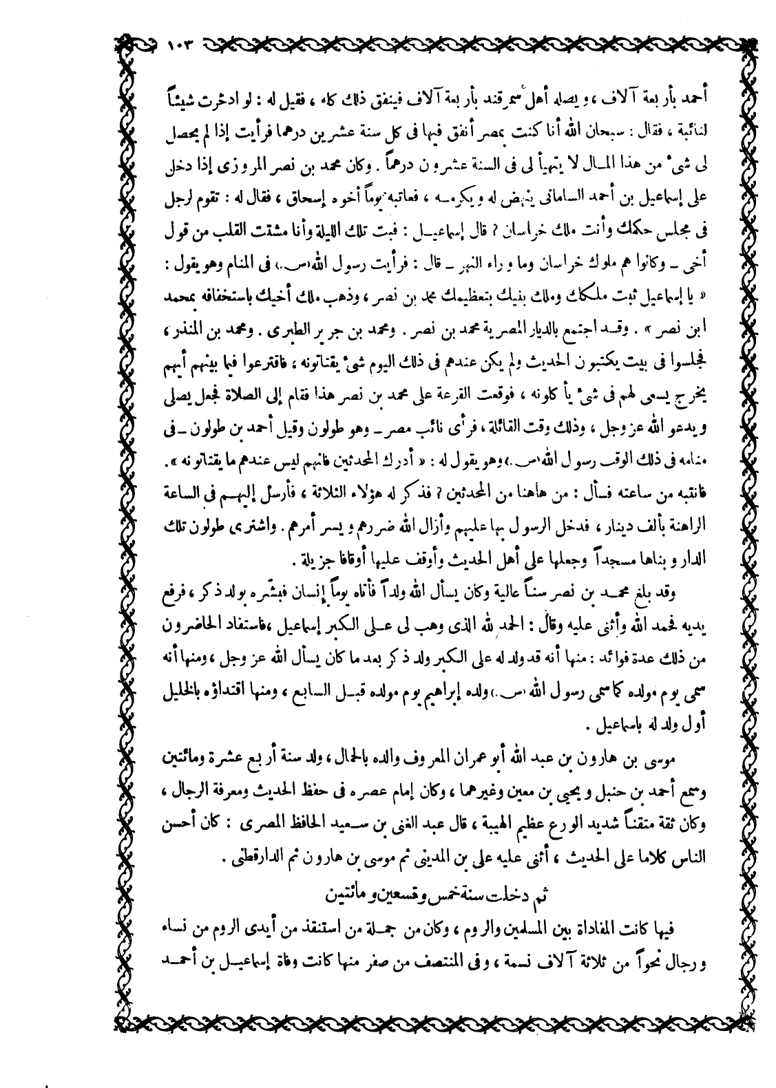فانتبه من ساعته فَسَأَلَ: مَنْ هَاهُنَا مِنَ الْمُحَدِّثِينَ؟ فَذُكِرَ لَهُ هَؤُلَاءِ الثَّلَاثَةُ، فَأَرْسَلَ إِلَيْهِمْ فِي السَّاعَةِ الرَّاهِنَةِ بألف دينار، فدخل الرسول بها عليهم وأزال الله ضررهم ويسر أمرهم. واشترى طولون تلك الدار وبناها مسجدا وجعلها على أهل الحديث وأوقف عليها أوقافا جزيلة.