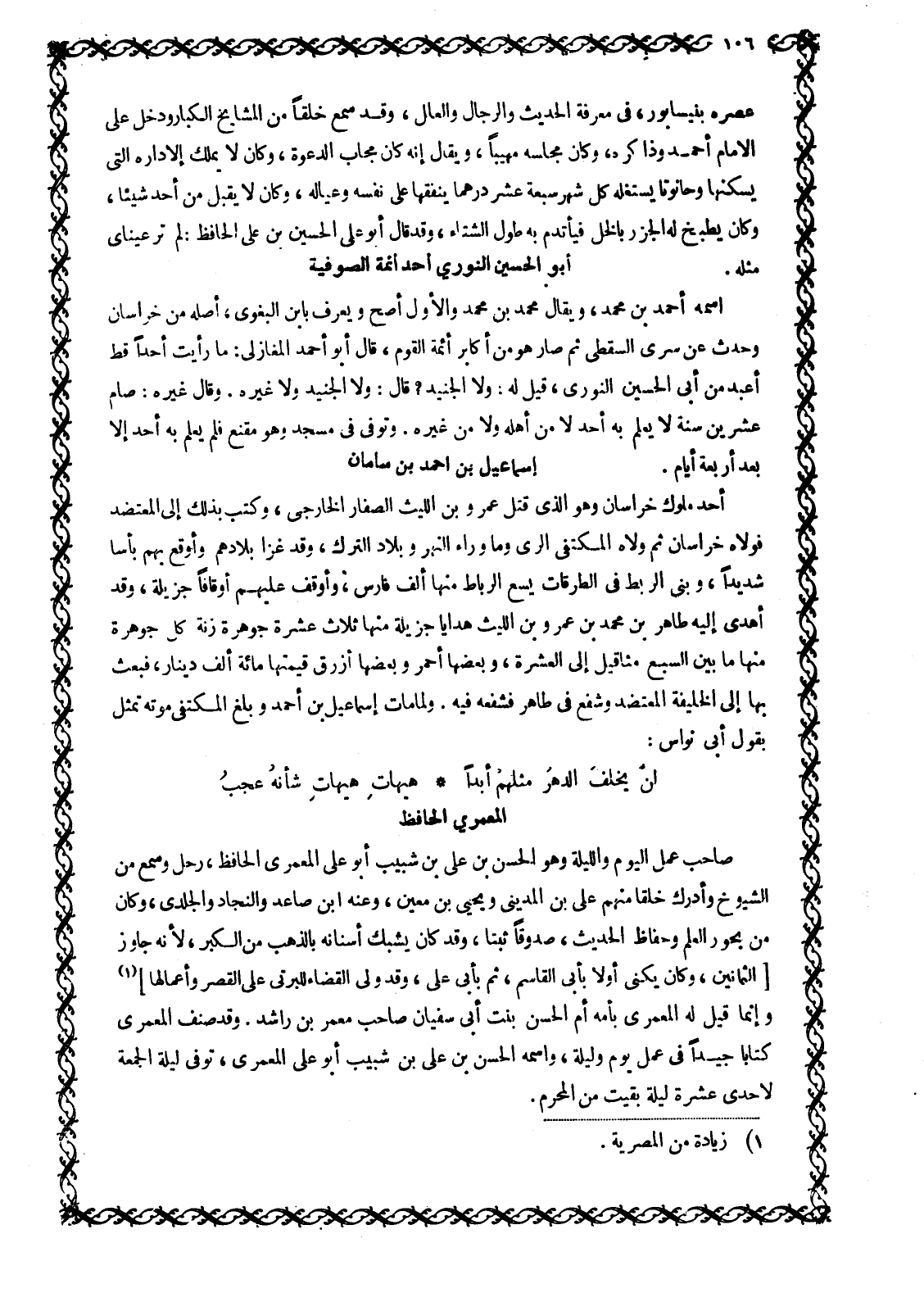 أحد ملوك خراسان وَهُوَ الَّذِي قَتَلَ عَمْرَو بْنَ اللَّيْثِ الصَّفَّارَ الخارجي، وكتب بذلك إلى الْمُعْتَضِدِ فَوَلَّاهُ خُرَاسَانَ ثُمَّ وَلَّاهُ الْمُكْتَفِي الرَّىَّ وما وراء النهر وبلاد الترك، وقد غزا بلادهم وأوقع بِهِمْ بَأْسًا شَدِيدًا، وَبَنَى الرُّبُطَ فِي الطُّرُقَاتِ يَسَعُ الرِّبَاطُ مِنْهَا أَلْفَ فَارِسٍ، وَأَوْقَفَ عَلَيْهِمْ أَوْقَافًا جَزِيلَةً، وَقَدْ أَهْدَى إِلَيْهِ طَاهِرُ بْنُ محمد بن عمرو بن الليث هدايا جزيلة مِنْهَا ثَلَاثَ عَشْرَةَ جَوْهَرَةً زِنَةُ كُلِّ جَوْهَرَةٍ منها ما بين السبع مَثَاقِيلَ إِلَى الْعَشَرَةِ، وَبَعْضُهَا أَحْمَرُ وَبَعْضُهَا أَزْرَقُ قِيمَتُهَا مِائَةُ أَلْفِ دِينَارٍ، فَبَعَثَ بِهَا إِلَى الْخَلِيفَةِ الْمُعْتَضِدِ وَشَفَعَ فِي طَاهِرٍ فَشَفَّعَهُ فِيهِ. وَلَمَّا مَاتَ إِسْمَاعِيلُ بْنُ أَحْمَدَ وَبَلَغَ الْمُكْتَفِيَ مَوْتُهُ تَمَثَّلَ بِقَوْلِ أَبِي نُوَاسٍ: