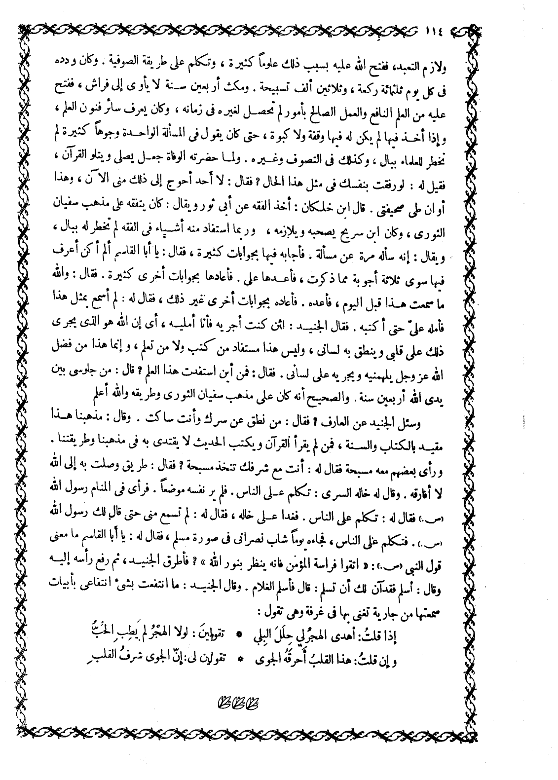 ولازم التعبد، ففتح الله عليه بسبب ذلك علوما كثيرة، وتكلم على طريقة الصوفية. وَكَانَ وِرْدُهُ فِي كُلِّ يَوْمٍ ثَلَاثَمِائَةِ رَكْعَةٍ، وَثَلَاثِينَ أَلْفَ تَسْبِيحَةٍ. وَمَكَثَ أَرْبَعِينَ سَنَةً لَا يأوى إلى فراش، ففتح عليه من العلم النافع والعمل الصالح بأمور لم تحصل لغيره في زمانه، وكان يعرف سائر فنون العلم، وإذا أخذ فيها لم يكن له فيها وقفة ولا كبوة، حتى كان يقول في المسألة الواحدة وجوها كثيرة لم تخطر للعلماء ببال، وكذلك في التصوف وغيره. ولما حضرته الوفاة جعل يصلى ويتلو القرآن، فقيل له: لو رفقت بنفسك في مثل هذا الحال؟ فقال: لا أَحَدٌ أَحْوَجَ إِلَى ذَلِكَ مِنِّي الْآنَ، وَهَذَا أوان طى صحيفتي. قَالَ ابْنُ خَلِّكَانَ: أَخَذَ الْفِقْهَ عَنْ أَبِي ثَوْرٍ وَيُقَالُ: كَانَ يَتَفَقَّهُ عَلَى مَذْهَبِ سُفْيَانَ الثَّوْرِيِّ، وكان ابن سريح يصحبه ويلازمه، [وربما استفاد منه أشياء في الفقه لم تخطر له ببال، ويقال: إنه سأله مرة عن مسألة، فأجابه فيها بجوابات كثيرة، فقال: يا أبا القاسم ألم أكن أعرف فيها سوى ثلاثة أجوبة مما ذكرت، فأعدها على. فأعادها بجوابات أخرى كثيرة. فقال: والله ما سمعت هذا قبل اليوم، فأعده. فأعاده بجوابات أخرى غير ذلك، فقال له: لم أسمع بمثل هذا فأمله عليّ حتى أكتبه. فقال الجنيد: لئن كنت أجريه فأنا أمليه، أي إن الله هو الّذي يجرى ذلك على قلبي وينطق به لساني، وليس هذا مستفاد من كتب ولا من تعلم، وإنما هذا من فضل الله عز وجل يلهمنيه ويجريه على لساني. فقال: فمن أين استفدت هذا العلم؟ قال: من جلوسي بين يدي الله أربعين سنة. والصحيح أنه كان على مذهب سفيان الثوري وطريقه والله أعلم [1]] .
