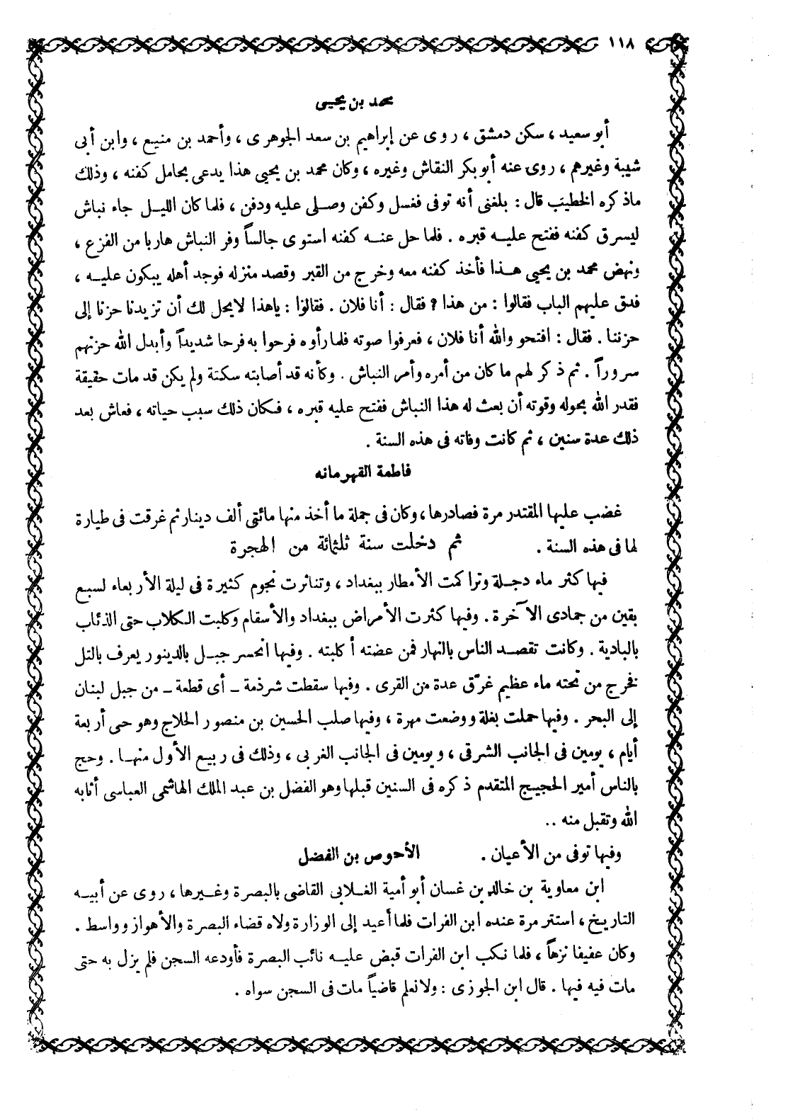 أَبُو سَعِيدٍ، سَكَنَ دِمَشْقَ، رَوَى عَنْ إِبْرَاهِيمَ بْنِ سَعْدٍ الْجَوْهَرِيِّ، وَأَحْمَدَ بْنِ مَنِيعٍ، وَابْنِ أَبِي شَيْبَةَ وَغَيْرِهِمْ، رَوَى عَنْهُ أَبُو بَكْرٍ النَّقَّاشُ وَغَيْرُهُ، وَكَانَ مُحَمَّدُ بْنُ يَحْيَى هَذَا يُدْعَى بِحَامِلِ كَفَنِهِ، وَذَلِكَ مَا ذَكَرَهُ الْخَطِيبُ قَالَ: بَلَغَنِي أَنَّهُ تُوُفِّيَ فَغُسِّلَ وَكُفِّنَ وَصُلِّيَ عَلَيْهِ وَدُفِنَ، فَلَمَّا كَانَ اللَّيْلُ جَاءَ نَبَّاشٌ لِيَسْرِقَ كَفَنَهُ فَفَتَحَ عَلَيْهِ قَبْرَهُ. فَلَمَّا حَلَّ عَنْهُ كَفَنُهُ اسْتَوَى جَالِسًا وَفَرَّ النَّبَّاشُ هَارِبًا مِنَ الْفَزَعِ، وَنَهَضَ مُحَمَّدُ بْنُ يَحْيَى هَذَا فَأَخَذَ كَفَنَهُ مَعَهُ وَخَرَجَ مِنَ الْقَبْرِ وَقَصَدَ مَنْزِلَهُ فَوَجَدَ أَهْلَهُ يَبْكُونَ عَلَيْهِ، فَدَقَّ عَلَيْهِمُ الْبَابَ فَقَالُوا: مَنْ هَذَا؟ فَقَالَ: أَنَا فُلَانٌ. فَقَالُوا: يَا هَذَا لَا يَحِلُّ لَكَ أَنْ تَزِيدَنَا حُزْنًا إِلَى حُزْنِنَا. فَقَالَ: افْتَحُوا وَاللَّهِ أَنَا فُلَانٌ، فَعَرَفُوا صَوْتَهُ فَلَمَّا رَأَوْهُ فَرِحُوا بِهِ فَرَحًا شَدِيدًا وَأَبْدَلَ اللَّهُ حُزْنَهُمْ سُرُورًا. ثُمَّ ذَكَرَ لَهُمْ مَا كَانَ مِنْ أَمْرِهِ وَأَمْرِ النَّبَّاشِ. وَكَأَنَّهُ قَدْ أَصَابَتْهُ سَكْتَةٌ وَلَمْ يَكُنْ قَدْ مَاتَ حَقِيقَةً فَقَدَّرَ اللَّهُ بِحَوْلِهِ وَقُوَّتِهِ أَنْ بَعَثَ لَهُ هَذَا النَّبَّاشَ فَفَتَحَ عَلَيْهِ قَبْرَهُ، فَكَانَ ذَلِكَ سَبَبَ حَيَاتِهِ، فَعَاشَ بَعْدَ ذَلِكَ عِدَّةَ سِنِينَ، ثُمَّ كَانَتْ وَفَاتُهُ فِي هَذِهِ السَّنَةِ.