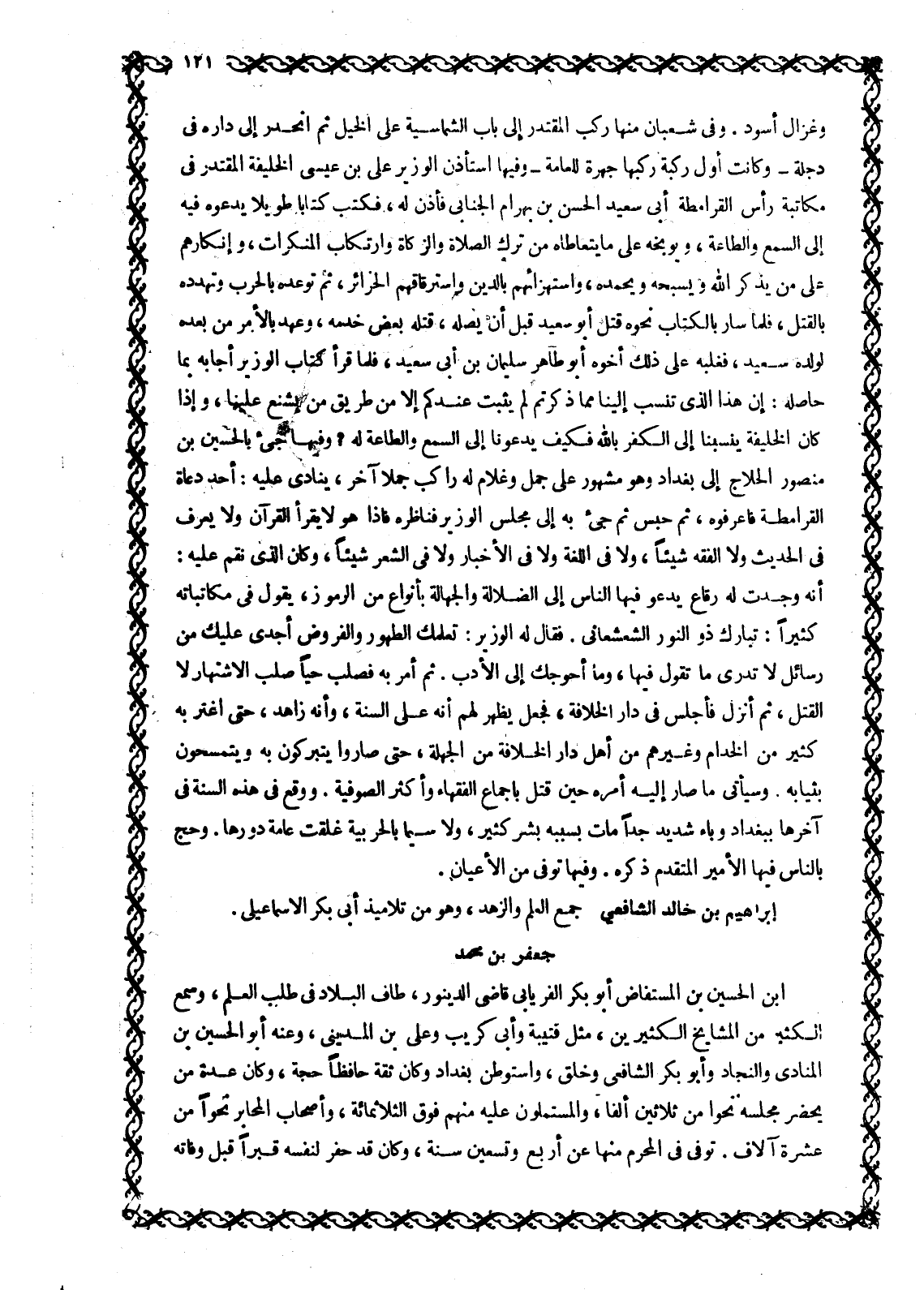 وَغَزَالٌ أَسْوَدُ. وَفِي شَعْبَانَ مِنْهَا رَكِبَ الْمُقْتَدِرُ إلى باب الشماسية على الخليل ثُمَّ انْحَدَرَ إِلَى دَارِهِ فِي دِجْلَةَ- وَكَانَتْ أَوَّلَ رَكْبَةٍ رَكِبَهَا جَهْرَةً لِلْعَامَّةِ- وَفِيهَا اسْتَأْذَنَ الْوَزِيرُ عَلِيُّ بْنُ عِيسَى الْخَلِيفَةَ الْمُقْتَدِرَ فِي مُكَاتَبَةِ رَأْسِ الْقَرَامِطَةِ أَبِي سَعِيدٍ الْحَسَنِ بْنِ بهرام الجنابي فأذن له، فكتب كِتَابًا طَوِيلًا يَدْعُوهُ فِيهِ إِلَى السَّمْعِ وَالطَّاعَةِ، ويوبخه على ما يتعاطاه من ترك الصلاة والزكاة وَارْتِكَابِ الْمُنْكِرَاتِ، وَإِنْكَارِهِمْ عَلَى مَنْ يَذْكُرُ اللَّهَ وَيُسَبِّحُهُ وَيَحْمَدُهُ، وَاسْتِهْزَائِهِمْ بِالدِّينِ وَاسْتِرْقَاقِهِمُ الْحَرَائِرَ، ثُمَّ تُوعَّدَهُ بِالْحَرْبِ وَتَهَدَّدَهُ بِالْقَتْلِ، فَلَمَّا سَارَ بِالْكِتَابِ نَحْوَهُ قُتِلَ أَبُو سَعِيدٍ قَبْلَ أَنْ يَصِلَهُ، قَتَلَهُ بَعْضُ خَدَمِهِ، وَعَهِدَ بِالْأَمْرِ مِنْ بَعْدِهِ لِوَلَدِهِ سَعِيدٍ، فَغَلَبَهُ عَلَى ذَلِكَ أَخُوهُ أَبُو طَاهِرٍ سُلَيْمَانُ بْنُ أَبَى سَعِيدٍ، فَلَمَّا قَرَأَ كتاب الوزير أَجَابَهُ بِمَا حَاصِلُهُ: إِنَّ هَذَا الَّذِي تَنْسِبُ إِلَيْنَا مِمَّا ذَكَرْتُمْ لَمْ يَثْبُتْ عِنْدَكُمْ إِلَّا مِنْ طَرِيقِ مَنْ يُشَنِّعُ عَلَيْنَا، وَإِذَا كَانَ الْخَلِيفَةُ يَنْسِبُنَا إِلَى الْكُفْرِ باللَّه فَكَيْفَ يَدْعُونَا إِلَى السَّمْعِ وَالطَّاعَةِ لَهُ؟ وَفِيهَا جِيءَ بِالْحُسَيْنِ بْنِ مَنْصُورٍ الْحَلَّاجِ إِلَى بَغْدَادَ وَهُوَ مَشْهُورٌ عَلَى جَمَلٍ وَغُلَامٌ لَهُ رَاكِبٌ جَمَلًا آخَرَ، ينادى عليه: أَحَدُ دُعَاةِ الْقَرَامِطَةِ فَاعْرِفُوهُ، ثُمَّ حُبِسَ ثُمَّ جيء به إِلَى مَجْلِسِ الْوَزِيرِ فَنَاظَرَهُ فَإِذَا هُوَ لَا يقرأ القرآن ولا يعرف في الحديث ولا الفقه شيئا، ولا في اللغة ولا في الأخبار ولا في الشِّعْرِ شَيْئًا، وَكَانَ الَّذِي نُقِمَ عَلَيْهِ: