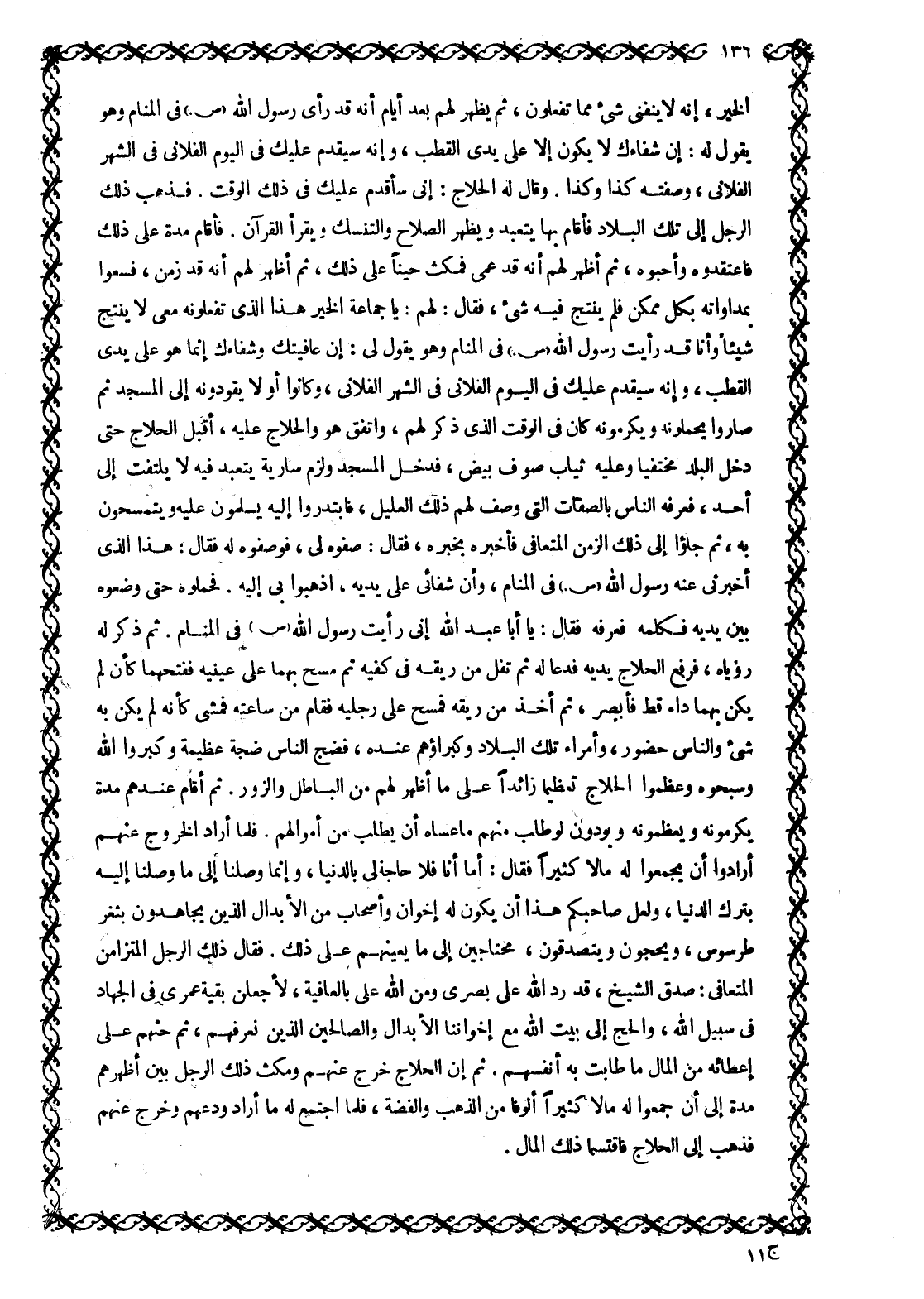 الخير، إنه لا ينفنى شيء مما تفعلون، ثم يظهر لهم بعد أيام أنه قد رَأَى رَسُولُ اللَّهِ صَلَّى اللَّهُ عَلَيْهِ وَسَلَّمَ في المنام وهو يقول له: إن شفاءك لا يكون إلا على يدي القطب، وإنه سيقدم عليك في اليوم الفلاني في الشهر الفلاني، وصفته كذا وكذا. وقال له الحلاج: إني سأقدم عليك في ذلك الوقت. فذهب ذلك الرجل إلى تلك البلاد فأقام بها يتعبد ويظهر الصلاح والتنسك ويقرأ القرآن. فأقام مدة على ذلك فاعتقدوه وأحبوه، ثُمَّ أَظْهَرَ لَهُمْ أَنَّهُ قَدْ عَمِيَ فَمَكَثَ حينا عَلَى ذَلِكَ، ثُمَّ أَظْهَرَ لَهُمْ أَنَّهُ قَدْ زمن، فسعوا بمداواته بكل ممكن فلم ينتج فيه شيء، فقال: لهم: يا جماعة الخير هذا الّذي تفعلونه معى لا ينتج شيئا وأنا قَدْ رَأَيْتُ رَسُولَ اللَّهِ صَلَّى اللَّهُ عَلَيْهِ وَسَلَّمَ في المنام وهو يقول لي: إن عافيتك وشفاءك إنما هو على يدي القطب، وإنه سيقدم عليك في اليوم الفلاني في الشهر الفلاني، وكانوا أو لا يقودونه إلى المسجد ثم صاروا يحملونه ويكرمونه كان في الوقت الّذي ذكر لهم، واتفق هو والحلاج عليه، أقبل الحلاج حتى دخل البلد مختفيا وعليه ثياب صوف بيض، فدخل المسجد ولزم سارية يتعبد فيه لا يلتفت إلى أحد، فعرفه الناس بالصفات التي وصف لهم ذلك العليل، فابتدروا إليه يسلمون عليه ويتمسحون به، ثم جاءوا إلى ذلك الزمن المتعافى فأخبره بخبره، فقال: صفوه لي، فوصفوه له فقال: هذا الّذي أخبرنى عَنْهُ رَسُولُ اللَّهِ صَلَّى اللَّهُ عَلَيْهِ وَسَلَّمَ في المنام، وأن شفائى على يديه، اذهبوا بى إِلَيْهِ. فَحَمَلُوهُ حَتَّى وَضَعُوهُ بَيْنَ يَدَيْهِ فَكَلَّمَهُ فعرفه فقال: يَا أَبَا عَبْدِ اللَّهِ إِنِّي رَأَيْتُ رَسُولَ اللَّهِ صَلَّى اللَّهُ عَلَيْهِ وَسَلَّمَ فِي الْمَنَامِ. ثم ذكر له رؤياه، فرفع الحلاج يديه فدعا له ثم تفل من ريقه في كفيه ثم مسح بهما على عينيه ففتحهما كأن لم يكن بهما داء قط فأبصر، ثم أخذ من ريقه فمسح على رجليه فقام من ساعته فمشى كأنه لم يكن به شيء والناس حضور، وأمراء تلك البلاد وكبراؤهم عنده، فضج الناس ضجة عظيمة وكبروا الله وسبحوه وعظموا الحلاج تعظيما زائدا على ما أظهر لهم من الباطل والزور. ثم أقام عندهم مدة يكرمونه ويعظمونه ويودون لو طلب منهم ما عساه أن يطلب من أموالهم. فلما أراد الخروج عنهم أرادوا أن يجمعوا له مالا كثيرا فقال: أما أنا فلا حاجة لي بالدنيا، وإنما وصلنا إلى ما وصلنا إليه بترك الدنيا، ولعل صاحبكم هذا أن يكون له إخوان وأصحاب من الأبدال الذين يجاهدون بثغر طرسوس، ويحجون ويتصدقون، محتاجين إلى ما يعينهم على ذلك. فقال ذلك الرجل المتزامن المتعافى: صدق الشيخ، قد رد الله على بصرى ومن الله على بالعافية، لأجعلن بقية عمري في الجهاد في سبيل الله، والحج إلى بيت الله مع إخواننا الأبدال والصالحين الذين نعرفهم، ثم حثهم على إعطائه من المال ما طابت به أنفسهم. ثم إن الحلاج خرج عنهم ومكث ذلك الرجل بين أظهرهم مدة إلى أن جمعوا له مالا كثيرا ألوفا من الذهب والفضة، فلما اجتمع له ما أراد ودعهم وخرج عنهم فَذَهَبَ إِلَى الْحَلَّاجِ فَاقْتَسَمَا ذَلِكَ الْمَالَ.