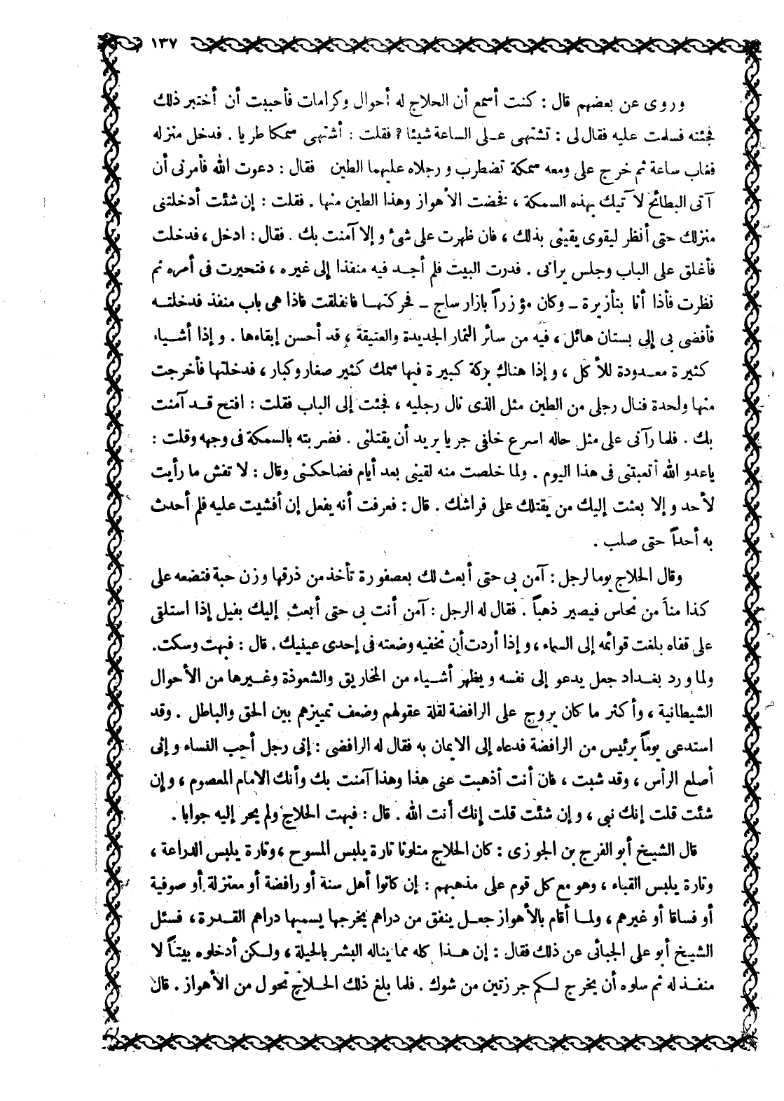 وَرُوِيَ عَنْ بَعْضِهِمْ قَالَ: كُنْتُ أَسْمَعُ أَنَّ الحلاج له أحوال وكرامات فأحببت أن أختبر ذلك فجئته فسلمت عليه فقال لي: تشتهي عَلَيَّ السَّاعَةَ شَيْئًا؟ فَقُلْتُ: أَشْتَهِي سَمَكًا طَرِيًّا. فدخل منزله فغاب ساعة ثم خرج على وَمَعَهُ سَمَكَةٌ تَضْطَرِبُ وَرِجْلَاهُ عَلَيْهِمَا الطِّينُ. فَقَالَ: دعوت الله فأمرنى أن آتى البطائح لآتيك بهذه السمكة، فخضت الْأَهْوَازَ وَهَذَا الطِّينُ مِنْهَا. فَقُلْتُ: إِنْ شِئْتَ أدخلتنى منزلك حتى انظر ليقوى يقيني بذلك، فَإِنْ ظَهَرْتُ عَلَى شَيْءٍ وَإِلَّا آمَنْتُ بِكَ. فقال: أدخل، فدخلت فأغلق على الباب وجلس يراني. قدرت البيت فلم أجد فيه مَنْفَذًا إِلَى غَيْرِهِ، فَتَحَيَّرْتُ فِي أَمْرِهِ ثُمَّ نظرت فإذا أنا بتأزيرة- وكان مؤزرا بإزار ساج- فحركتها فانفلقت فإذا هي باب منفذ فدخلته فأفضى بى إلى بستان هائل، فيه من سائر التمار الجديدة والعتيقة، قد أحسن إبقاءها. وإذا أشياء كثيرة معدودة لِلْأَكْلِ، وَإِذَا هُنَاكَ بِرْكَةٌ كَبِيرَةٌ فِيهَا سَمَكٌ كثير صغار وكبار، فَدَخَلْتُهَا فَأَخْرَجْتُ مِنْهَا وَاحِدَةً فَنَالَ رِجْلِي مِنَ الطين مثل الّذي نال رجليه، فجئت إلى الباب فقلت: افتح قد آمنت بك. فلما رآني على مثل حاله أسرع خلفي جريا يريد أن يقتلني. فَضَرَبْتُهُ بِالسَّمَكَةِ فِي وَجْهِهِ وَقُلْتُ: