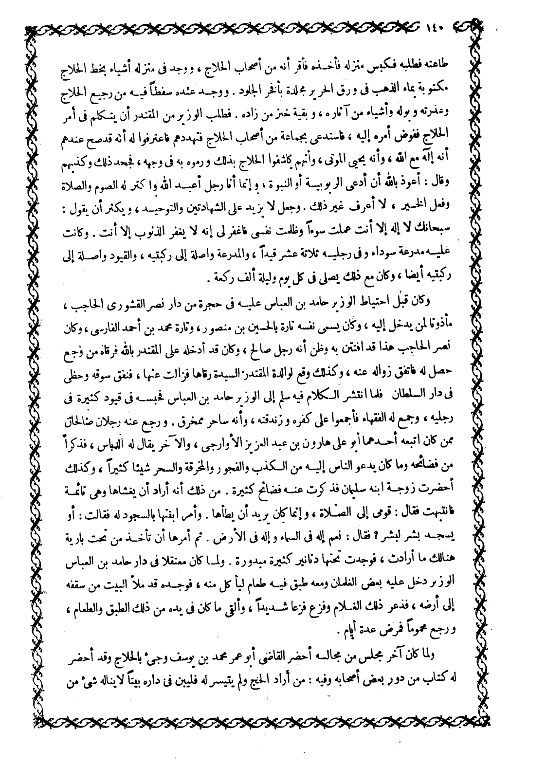طاعته فطلبه فكبس منزله فأخذه فَأَقَرَّ أَنَّهُ مِنْ أَصْحَابِ الْحَلَّاجِ، وَوَجَدَ فِي منزله أشياء بخط الحلاج مكتوبة بِمَاءِ الذَّهَبِ فِي وَرَقِ الْحَرِيرِ مُجَلَّدَةً بِأَفْخَرِ الْجُلُودِ. وَوَجَدَ عِنْدَهُ سَفَطًا فِيهِ مِنْ رَجِيعِ الحلاج وعذرته وَبَوْلِهِ وَأَشْيَاءَ مِنْ آثَارِهِ، وَبَقِيَّةِ خُبْزٍ مِنْ زَادِهِ. فَطَلَبَ الْوَزِيرُ مِنَ الْمُقْتَدِرِ أَنْ يَتَكَلَّمَ فِي أَمْرِ الْحَلَّاجِ فَفَوَّضَ أَمْرَهُ إِلَيْهِ، فَاسْتَدْعَى بِجَمَاعَةٍ مِنْ أَصْحَابِ الْحَلَّاجِ فَتَهَدَّدَهُمْ فَاعْتَرَفُوا لَهُ أنه قد صح عندهم أنه إله مع الله، وأنه يحيى الموتى، وأنهم كاشفوا الحلاج بذلك ورموه به في وجهه، فَجَحَدَ ذَلِكَ وَكَذَّبَهُمْ وَقَالَ: أَعُوذُ باللَّه أَنْ أَدَّعِيَ الرُّبُوبِيَّةَ أَوِ النُّبُوَّةَ، وَإِنَّمَا أَنَا رَجُلٌ أعبد الله وأكثر له الصوم والصلاة وفعل الخير، لا أَعْرِفُ غَيْرَ ذَلِكَ. وَجَعَلَ لَا يَزِيدُ عَلَى الشَّهَادَتَيْنِ وَالتَّوْحِيدِ، وَيُكْثِرُ أَنْ يَقُولَ: