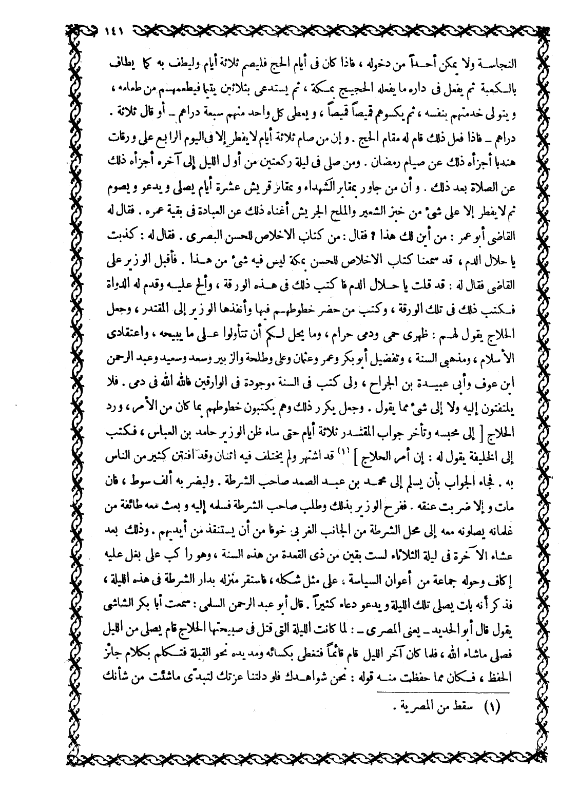 النَّجَاسَةِ وَلَا يُمَكِّنُ أَحَدًا مِنْ دُخُولِهِ، فَإِذَا كَانَ فِي أَيَّامِ الْحَجِّ فَلْيَصُمْ ثَلَاثَةَ أَيَّامٍ وَلْيَطُفْ بِهِ كَمَا يُطَافُ بِالْكَعْبَةِ ثُمَّ يَفْعَلُ فِي دَارِهِ مَا يَفْعَلُهُ الْحَجِيجُ بِمَكَّةَ، ثُمَّ يَسْتَدْعِي بِثَلَاثِينَ يَتِيمًا فَيُطْعِمُهُمْ مِنْ طَعَامِهِ، وَيَتَوَلَّى خِدْمَتَهُمْ بِنَفْسِهِ، ثُمَّ يَكْسُوهُمْ قَمِيصًا قَمِيصًا، وَيُعْطِي كُلَّ وَاحِدٍ مِنْهُمْ سَبْعَةَ دَرَاهِمَ- أَوْ قَالَ ثَلَاثَةَ، دَرَاهِمَ- فَإِذَا فَعَلَ ذَلِكَ قَامَ لَهُ مَقَامَ الْحَجِّ. وَإِنَّ مَنْ صَامَ ثَلَاثَةَ أَيَّامٍ لَا يُفْطِرُ إِلَّا فِي الْيَوْمِ الرَّابِعِ عَلَى وَرَقَاتِ هِنْدَبَا أَجْزَأَهُ ذَلِكَ عَنْ صِيَامِ رَمَضَانَ. وَمَنْ صَلَّى فِي لَيْلَةٍ رَكْعَتَيْنِ مِنْ أَوَّلِ اللَّيْلِ إِلَى آخِرِهِ أَجْزَأَهُ ذَلِكَ عَنِ الصَّلَاةِ بَعْدَ ذَلِكَ. وَأَنَّ مَنْ جَاوَرَ بِمَقَابِرِ الشُّهَدَاءِ وبمقابر قُرَيْشٍ عَشَرَةَ أَيَّامٍ يُصَلِّي وَيَدْعُو وَيَصُومُ ثُمَّ لَا يُفْطِرُ إِلَّا عَلَى شَيْءٍ مِنْ خُبْزِ الشَّعِيرِ وَالْمِلْحِ الْجَرِيشِ أَغْنَاهُ ذَلِكَ عَنِ الْعِبَادَةِ فِي بَقِيَّةِ عُمُرِهِ. فَقَالَ لَهُ الْقَاضِي أَبُو عُمَرَ: مِنْ أَيْنَ لَكَ هَذَا؟ فَقَالَ: مِنْ كِتَابِ الْإِخْلَاصِ لِلْحَسَنِ الْبَصْرِيِّ. فَقَالَ لَهُ: كَذَبْتَ يا حلال الدم، وقد سَمِعْنَا كِتَابَ الْإِخْلَاصِ لِلْحَسَنِ بِمَكَّةَ لَيْسَ فِيهِ شيء من هذا. فأقبل الوزير على القاضي فَقَالَ لَهُ: قَدْ قُلْتَ يَا حَلَالَ الدَّمِ فَاكْتُبْ ذَلِكَ فِي هَذِهِ الْوَرَقَةِ، وَأَلَحَّ عَلَيْهِ وَقَدَّمَ لَهُ الدَّوَاةَ فَكَتَبَ ذَلِكَ فِي تِلْكَ الْوَرَقَةِ، وَكَتَبَ مَنْ حَضَرَ خُطُوطَهُمْ فِيهَا وَأَنْفَذَهَا الْوَزِيرُ إِلَى الْمُقْتَدِرِ، وَجَعَلَ الْحَلَّاجُ يَقُولُ لَهُمْ: ظَهْرِي حِمًى وَدَمِي حَرَامٌ، وَمَا يَحِلُّ لَكُمْ أن تتأولوا على ما يبيحه، واعتقادي الإسلام، ومذهبي السنة، وتفضيل أَبُو بَكْرٍ وَعُمَرُ وَعُثْمَانُ وَعَلِيٌّ وَطَلْحَةُ وَالزُّبَيْرُ وَسَعْدٍ وسعيد وعبد الرحمن ابن عَوْفٍ وَأَبِي عُبَيْدَةَ بْنِ الْجَرَّاحِ، وَلِي كُتُبٌ في السنة موجودة في الوارقين فاللَّه الله في دمي. فلا يلتفتون إليه ولا إِلَى شَيْءٍ مِمَّا يَقُولُ. وَجَعَلَ يُكَرِّرُ ذَلِكَ وَهُمْ يَكْتُبُونَ خُطُوطَهُمْ بِمَا كَانَ مِنَ الْأَمْرِ، وَرُدَّ الْحَلَّاجُ [إِلَى مَحْبِسِهِ وَتَأَخَّرَ جَوَابُ الْمُقْتَدِرِ ثَلَاثَةَ أَيَّامٍ حَتَّى سَاءَ ظَنُّ الْوَزِيرِ حَامِدِ بْنِ الْعَبَّاسِ، فَكَتَبَ إِلَى الْخَلِيفَةِ يَقُولُ لَهُ: إِنَّ أَمْرَ الْحَلَّاجِ] [1] قَدِ اشْتَهَرَ وَلَمْ يَخْتَلِفْ فِيهِ اثْنَانِ وَقَدِ افْتَتَنَ كَثِيرٌ مِنَ النَّاسِ بِهِ. فَجَاءَ الْجَوَابُ بِأَنْ يُسَلَّمَ إِلَى مُحَمَّدِ بن عبد الصمد صاحب الشرطة. وليضر به أَلْفَ سَوْطٍ، فَإِنْ مَاتَ وَإِلَّا ضُرِبَتُ عُنُقُهُ. فَفَرِحَ الْوَزِيرُ بِذَلِكَ وَطَلَبَ صَاحِبَ الشُّرْطَةِ فَسَلَّمَهُ إليه وبعث معه طائفة من غلمانه يصلونه مَعَهُ إِلَى مَحَلِّ الشُّرْطَةِ مِنَ الْجَانِبِ الْغَرْبِيِّ خَوْفًا مِنْ أَنْ يُسْتَنْقَذَ مِنْ أَيْدِيهِمْ. وَذَلِكَ بَعْدَ عِشَاءِ الْآخِرَةِ فِي لَيْلَةِ الثُّلَاثَاءِ لِسِتٍّ بَقِينَ مِنْ ذِي الْقِعْدَةِ مِنْ هَذِهِ السَّنَةِ، وَهُوَ رَاكِبٌ عَلَى بَغْلٍ عَلَيْهِ إِكَافٌ وَحَوْلَهُ جَمَاعَةٌ مِنْ أَعْوَانِ السِّيَاسَةِ. عَلَى مِثْلِ شَكْلِهِ، فَاسْتَقَرَّ مَنْزِلُهُ بِدَارِ الشُّرْطَةِ فِي هَذِهِ اللَّيْلَةِ، فذكر أنه بات يصلى تلك اللَّيْلَةِ وَيَدْعُو دُعَاءً كَثِيرًا. قَالَ أَبُو عَبْدِ الرَّحْمَنِ السُّلَمِيُّ: سَمِعْتُ أَبَا بَكْرٍ الشَّاشِيَّ يَقُولُ قَالَ أَبُو الْحَدِيدِ- يَعْ