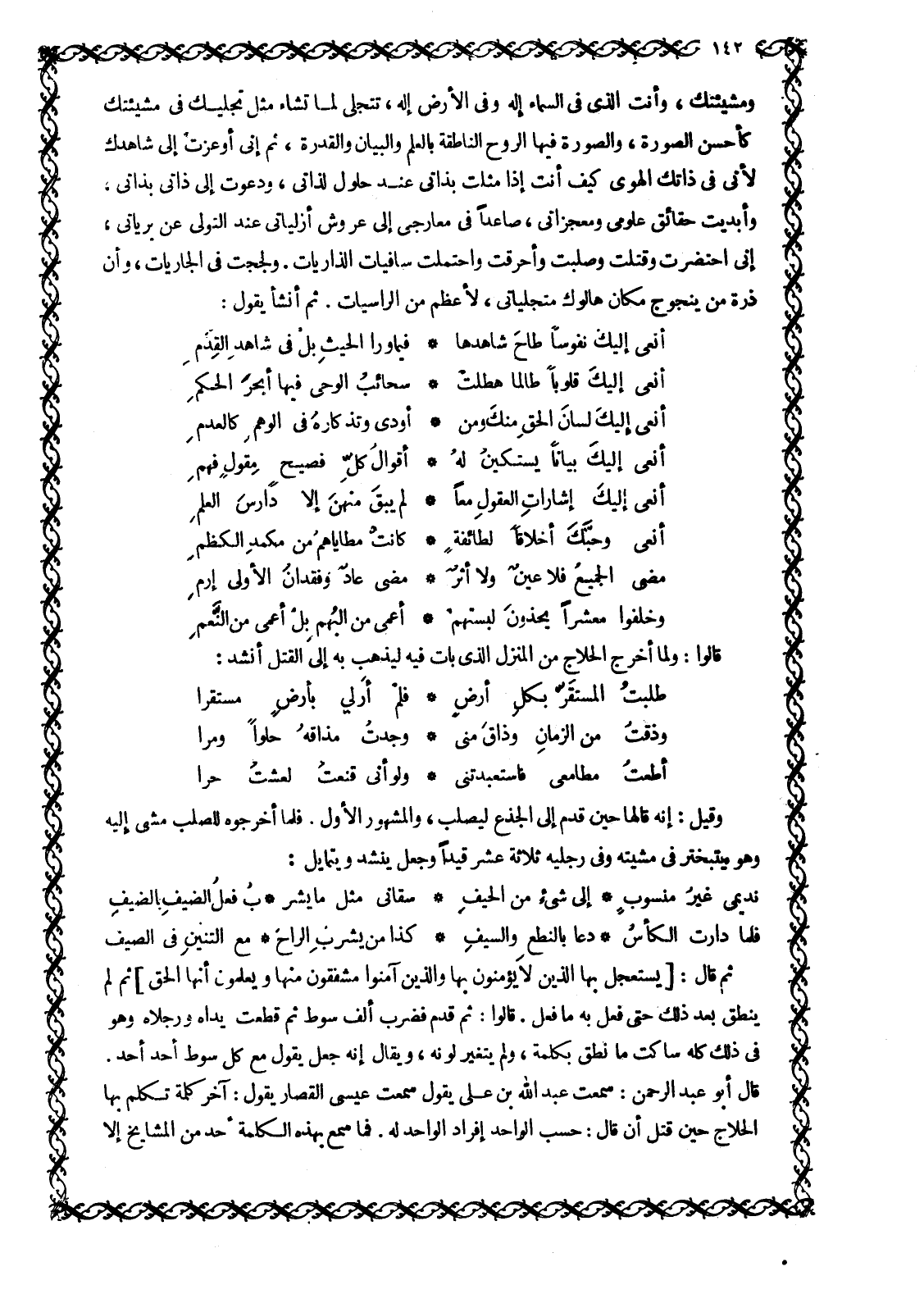 وَمَشِيئَتِكَ، وَأَنْتَ الَّذِي فِي السَّمَاءِ إِلَهٌ وَفِي الْأَرْضِ إِلَهٌ، تَتَجَلَّى لِمَا تَشَاءُ مِثْلَ تَجَلِّيكَ فِي مَشِيئَتِكَ كَأَحْسَنِ الصُّورَةِ، وَالصُّورَةُ فِيهَا الرُّوحُ الناطقة بالعلم والبيان والقدرة، ثم إني أو عزت إِلَيَّ شَاهِدَكَ لِأَنِّي فِي ذَاتِكَ الْهُوِيُّ كَيْفَ أنت إذا مثلت بذاتى عند حلول لذاتي، وَدَعَوْتَ إِلَى ذَاتِي بِذَاتِي، وَأَبْدَيْتَ حَقَائِقَ عُلُومِي وَمُعْجِزَاتِي، صَاعِدًا فِي مَعَارِجِي إِلَى عُرُوشِ أَزَلِيَّاتِي عند التولي عن بِرِيَّاتِي، إِنِّي احْتُضِرْتُ وَقُتِلْتُ وَصُلِبْتُ وَأُحْرِقْتُ وَاحْتُمِلْتُ سافيات الذَّارِيَاتِ. وَلَجَجْتُ فِي الْجَارِيَاتِ، وَإِنَّ ذَرَّةً مِنْ يَنْجُوجٍ مَكَانَ هَالُوكِ مُتَجَلَّيَاتِي، لَأَعْظَمُ مِنَ الرَّاسِيَاتِ. ثُمَّ أَنْشَأَ يَقُولُ: