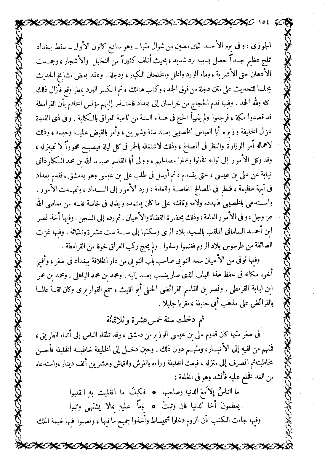 الْجَوْزِيِّ: وَفِي يَوْمِ الْأَحَدِ لِثَمَانٍ مَضَيْنَ مِنْ شَوَّالٍ مِنْهَا- وَهُوَ سَابِعُ كَانُونَ الْأَوَّلِ- سَقَطَ ببغداد ثلج عظيم جدا حصل بِسَبَبِهِ بَرْدٌ شَدِيدٌ، بِحَيْثُ أَتْلَفَ كَثِيرًا مِنَ النَّخِيلِ وَالْأَشْجَارِ، وَجَمَدَتِ الْأَدْهَانُ حَتَّى الْأَشْرِبَةُ، وَمَاءُ الْوَرْدِ وَالْخَلُّ وَالْخِلْجَانُ الْكِبَارُ، وَدِجْلَةُ. وَعَقَدَ بَعْضُ مشايخ الحديث مجلسا للتحديث عَلَى مَتْنِ دِجْلَةَ مِنْ فَوْقِ الْجَمْدِ، وَكُتِبَ هُنَالِكَ، ثُمَّ انْكَسَرَ الْبَرْدُ بِمَطَرٍ وَقَعَ فَأَزَالَ ذلك كله وللَّه الحمد. وفيها قدم الْحُجَّاجُ مِنْ خُرَاسَانَ إِلَى بَغْدَادَ فَاعْتَذَرَ إِلَيْهِمْ مُؤْنِسٌ الْخَادِمُ بِأَنَّ الْقَرَامِطَةَ قَدْ قَصَدُوا مَكَّةَ، فَرَجَعُوا وَلَمْ يَتَهَيَّأِ الْحَجُّ فِي هَذِهِ السَّنَةِ مِنْ نَاحِيَةِ الْعِرَاقِ بِالْكُلِّيَّةِ. وَفِي ذِي الْقَعْدَةِ عَزَلَ الْخَلِيفَةُ وَزِيرَهُ أَبَا الْعَبَّاسِ الْخَصِيبِيَّ بَعْدَ سَنَةٍ وَشَهْرَيْنِ، وَأَمَرَ بِالْقَبْضِ عَلَيْهِ وَحَبْسِهِ، وَذَلِكَ لاهماله أمر الوزارة والنظر في المصالح، وذلك لِاشْتِغَالِهِ بِالْخَمْرِ فِي كُلِّ لَيْلَةٍ فَيُصْبِحُ مَخْمُورًا لا تمييز لَهُ، وَقَدْ وَكَلَ الْأُمُورَ إِلَى نُوَّابِهِ فَخَانُوا وعملوا مصالحهم، وولى أبا القاسم عبيد الله بن محمد الكلوذاني نِيَابَةً عَنْ عَلِيِّ بْنِ عِيسَى، حَتَّى يَقْدَمَ، ثُمَّ أَرْسَلَ فِي طَلَبِ عَلِيِّ بْنِ عِيسَى وهو بدمشق، فَقَدِمَ بَغْدَادَ فِي أُبَّهَةٍ عَظِيمَةٍ، فَنَظَرَ فِي المصالح الخاصة والعامة، ورد الأمور إلى السداد، وتمهدت الأمور.
