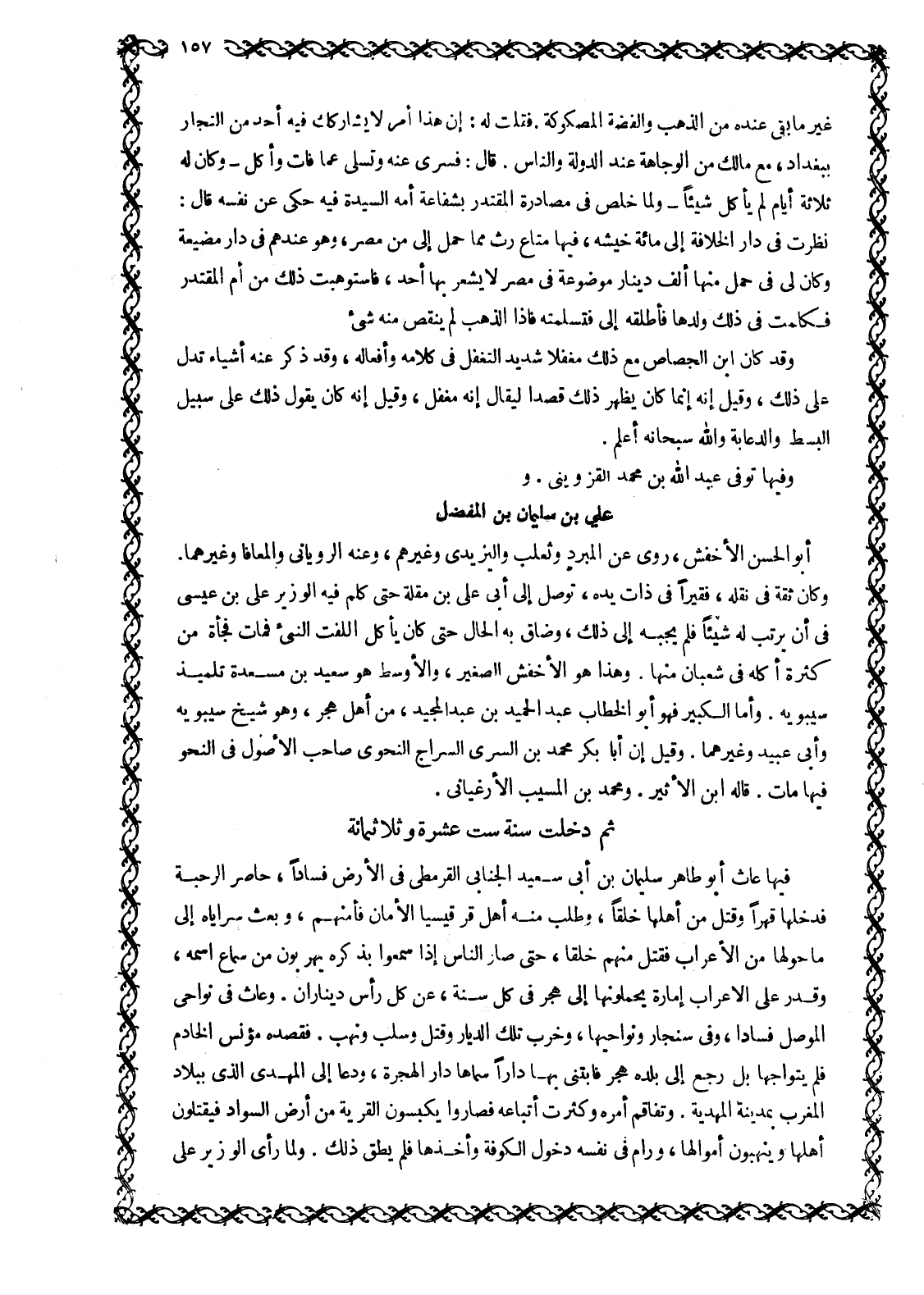 وَكَانَ ثِقَةً فِي نَقْلِهِ، فَقِيرًا فِي ذَاتِ يَدِهِ، تَوَصَّلَ إِلَى أَبِي عَلِيِّ بْنِ مُقْلَةَ حَتَّى كَلَّمَ فِيهِ الْوَزِيرَ عَلِيَّ بن عيسى في أن يرتب له شيئا فَلَمْ يُجِبْهُ إِلَى ذَلِكَ، وَضَاقَ بِهِ الْحَالُ حتى كان يأكل اللفت النيء فمات فجأة من كثرة أكله في شعبان منها. وهذا هو الأخفش الصغير، والأوسط وهو سعيد بن مسعدة تلميذ سيبويه. وأما الكبير فَهُوَ أَبُو الْخَطَّابِ عَبْدُ الْحَمِيدِ بْنُ عَبْدِ الْمَجِيدِ، مِنْ أَهْلِ هَجَرَ، وَهُوَ شَيْخُ سِيبَوَيْهِ وأبى عبيد وغيرهما. وقيل إن أبا بَكْرٍ مُحَمَّدُ بْنُ السَّرِيِّ السَّرَّاجُ النَّحْوِيُّ صَاحِبُ الأصول في النحو فيها مات. قَالَهُ ابْنُ الْأَثِيرِ. وَمُحَمَّدُ بْنُ الْمُسَيَّبِ الْأَرْغِيَانِيُّ.