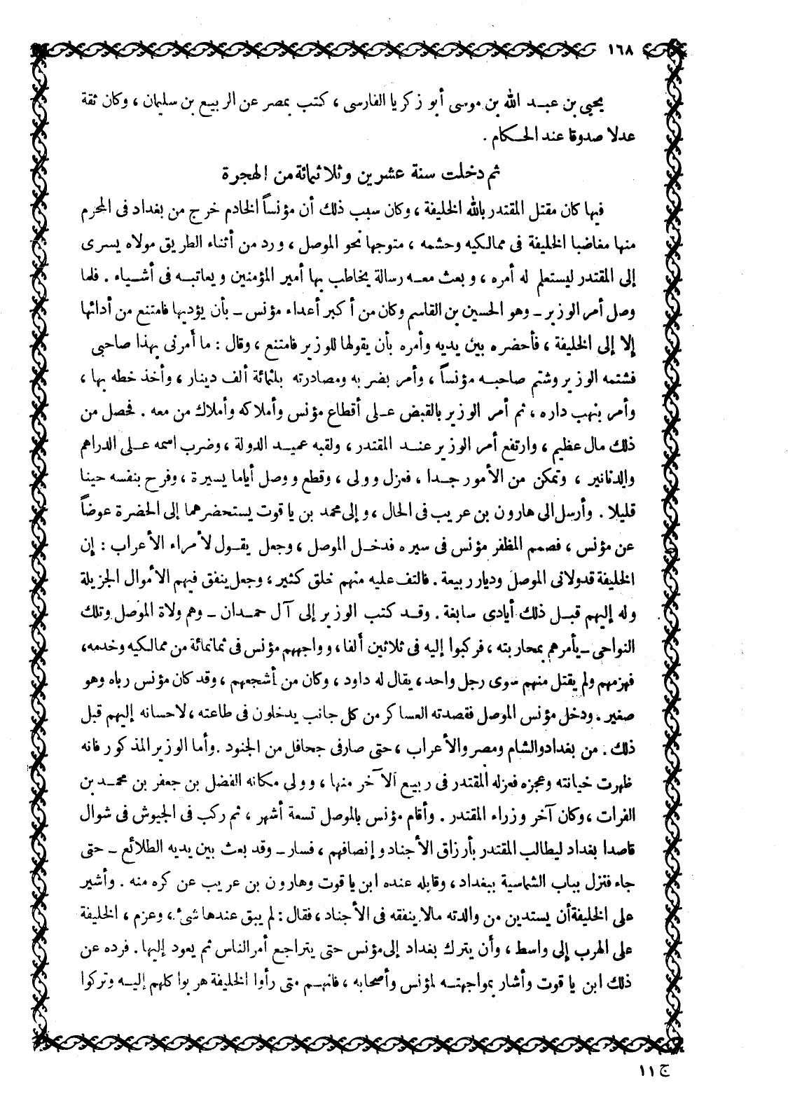 فيها كان مقتل المقتدر باللَّه الخليفة، وَكَانَ سَبَبُ ذَلِكَ أَنَّ مُؤْنِسًا الْخَادِمَ خَرَجَ من بغداد في المحرم منها مغاضبا الخليفة فِي مَمَالِيكِهِ وَحَشَمِهِ، مُتَوَجِّهًا نَحْوَ الْمَوْصِلِ، وَرَدَّ من أثناء الطريق مولاه يسرى إلى المقتدر ليستعلم له أمره، وَبَعَثَ مَعَهُ رِسَالَةً يُخَاطِبُ بِهَا أَمِيرَ الْمُؤْمِنِينَ ويعاتبه في أشياء. فلما وصل أمر الوزير- وهو الْحُسَيْنَ بْنَ الْقَاسِمِ وَكَانَ مِنْ أَكْبَرِ أَعْدَاءِ مؤنس- بأن يؤديها فَامْتَنَعَ مِنْ أَدَائِهَا إِلَّا إِلَى الْخَلِيفَةِ، فَأَحْضَرَهُ بين يديه وأمره بأن يقولها للوزير فامتنع، وقال: ما أمرنى بهذا صاحبي.